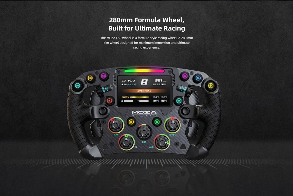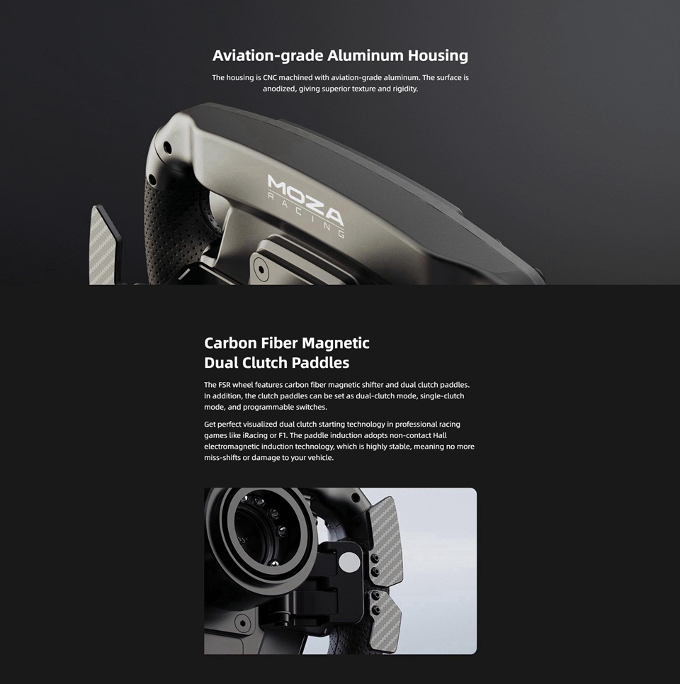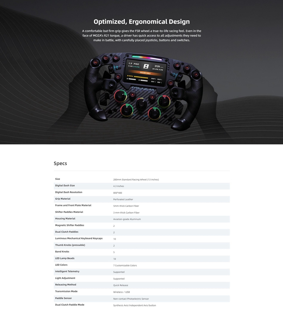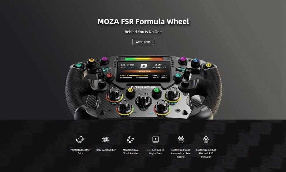 - FSR sets the bar for excellence. Immerse yourself in unparalleled luxury with perforated leather grips for ultimate comfort and grip. For Toray carbon fiber construction ensures lightweight durability and a striking aesthetic. Experience lightning-fast gear changes with the magnetic dual clutch paddles. Maintain full control over your race with the 4.3-inch built-in digital dash, providing real-time racing data at your fingertips. Enjoy seamless transitions with the customized Quick-Release from Real Racing and customize your experience further with customizable RGB RPM and shift indicators, adding a vibrant touch to your setup.