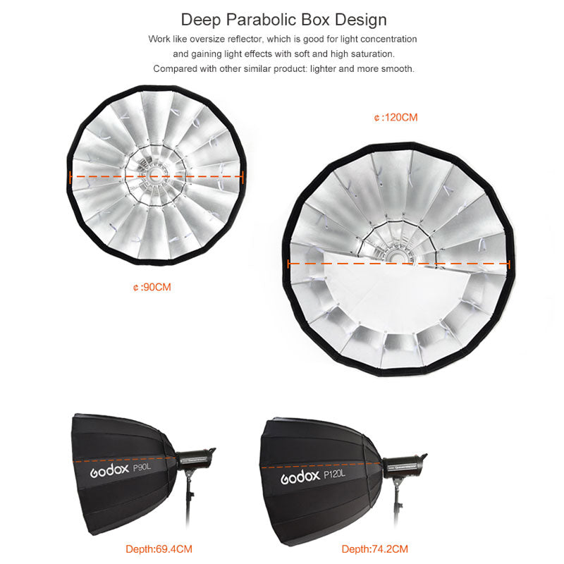 The Deep Parabolic Softbox adopts a parabolic design with a large depth and can send light straight from a long distance, so that the light decreases from the center to the edge, and the light changes more uniformly, providing high saturation and high softness for shooting. It is easy to install, easy to operate. It is portable and can be used widely.