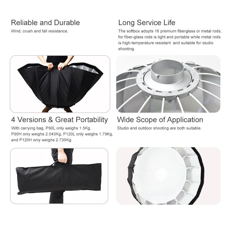 - Deep parabolic design: The effect is similar to a large reflector, which is conducive to concentrating light and providing high saturation and high softness for shooting. Compared with other similar products, its advantages include smoothness and no wrinkles, better light efficiency, and lighter weight