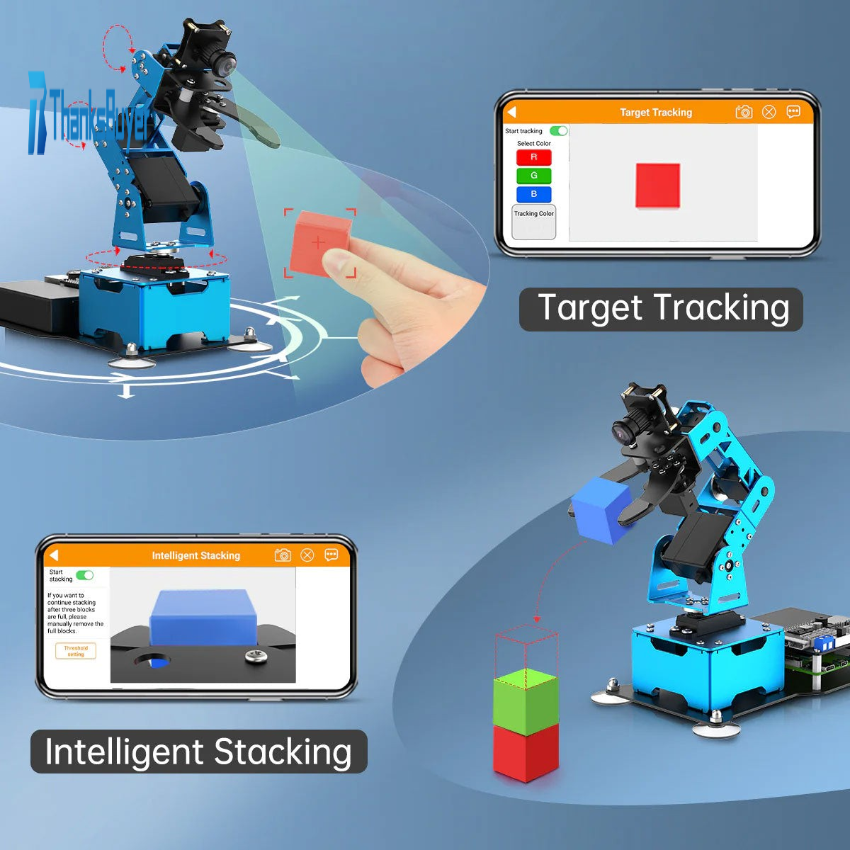 Robot base adopts full-metal high torque servo with metal servo horn which brings stronger force. And robotic arm end uses micro anti-blocking servo with high accuracy and longer service life.