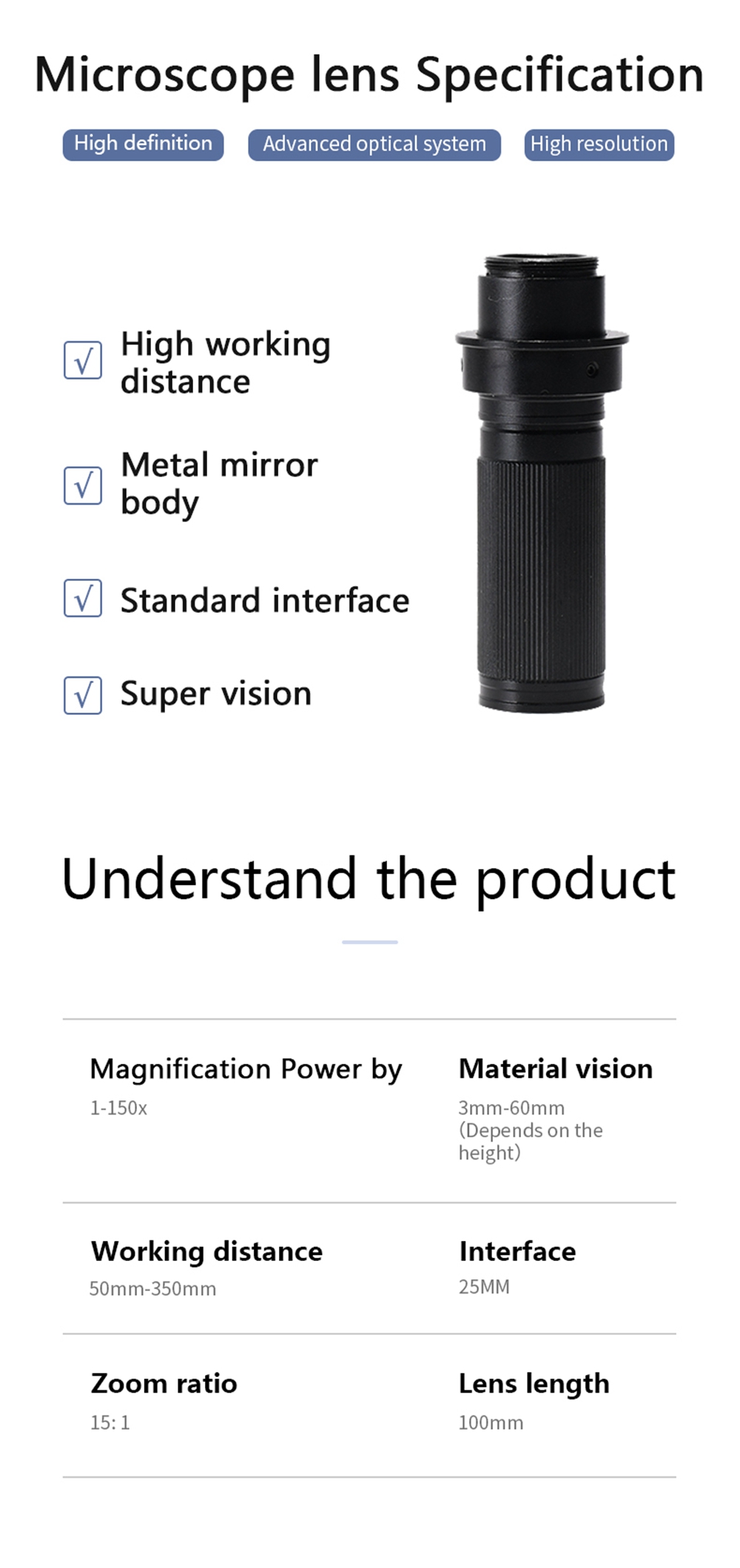 - Magnification Power by 0.11X-2X (about 8X -150X on the Monitor)