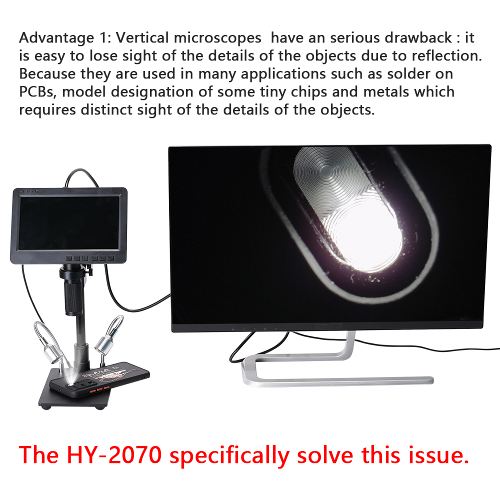 - HY-2070 specifically solves this problem. It is an adjustable angle digital microscope that solves the problem of light reflection. It can effectively reduce the reflection of metal objects and clearly display the details of the components.
