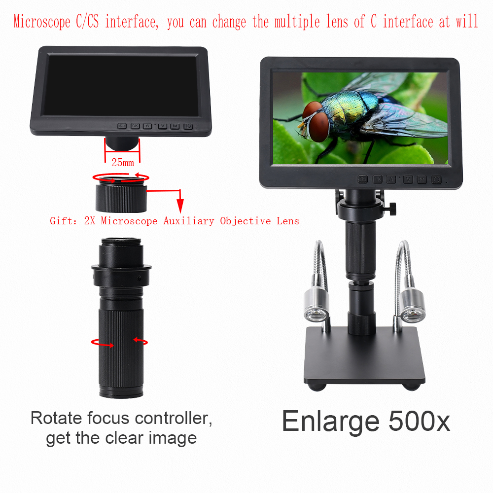 - This microscope is more extensible: C-mount (25mm) is used. Real lens optical magnification: 300X, digital magnification 2100X. C-mount lenses of other magnifications can be replaced at will (if you need other styles of lenses, please contact customer service).