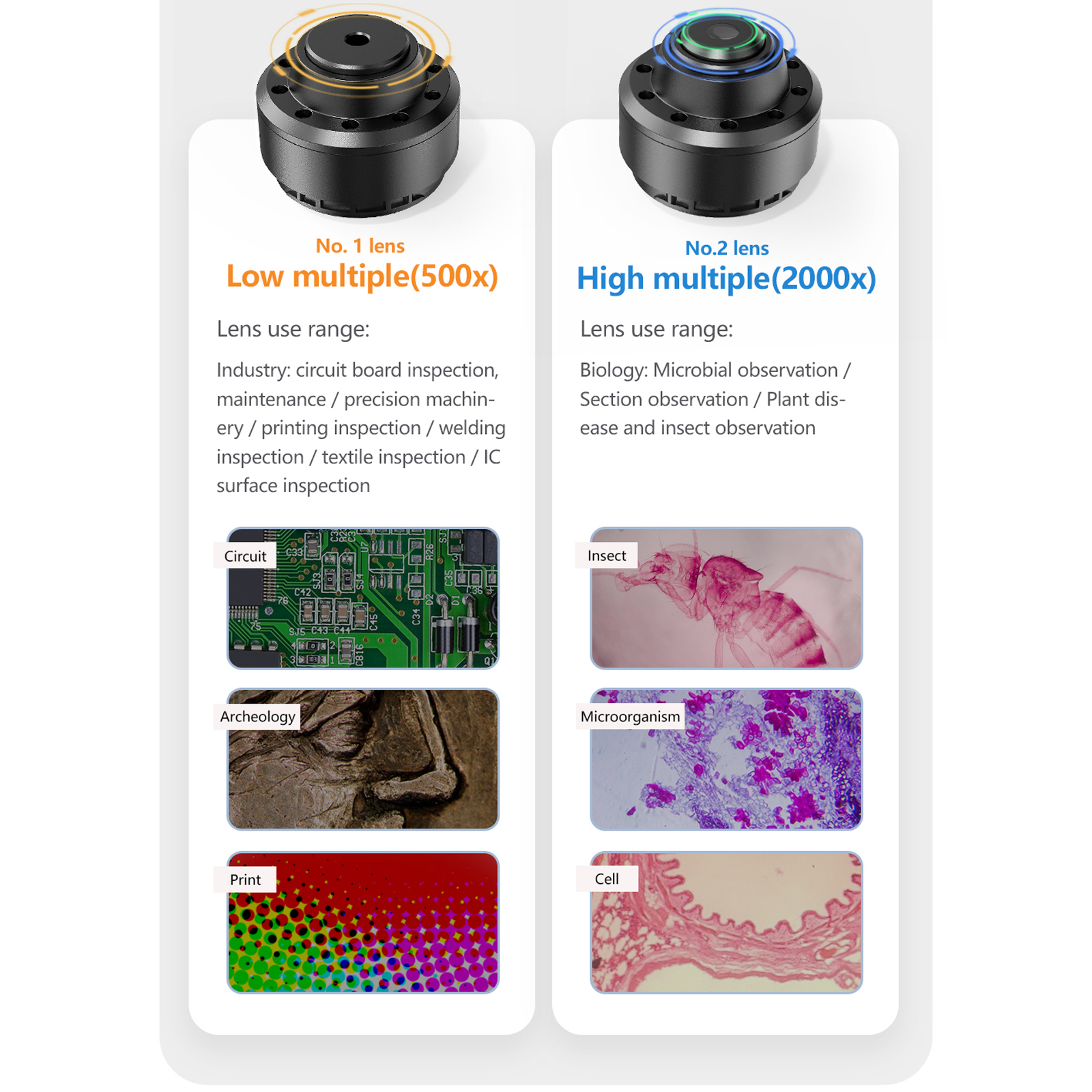 - Two lenses have their own uses: No.1 500X lens is suitable for circuit board maintenance and inspection, printing inspection, jades and gem identification, etc. No.2 2000X lens is suitable for microbial observation, section observation, plant pests and diseases observation and the like.