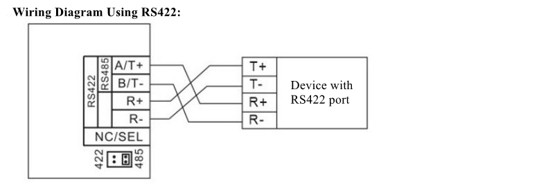 1. A/T+: RS485 signal + or RS422 sending+