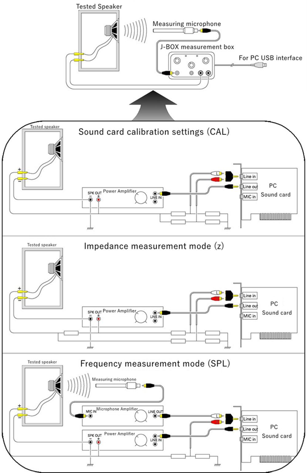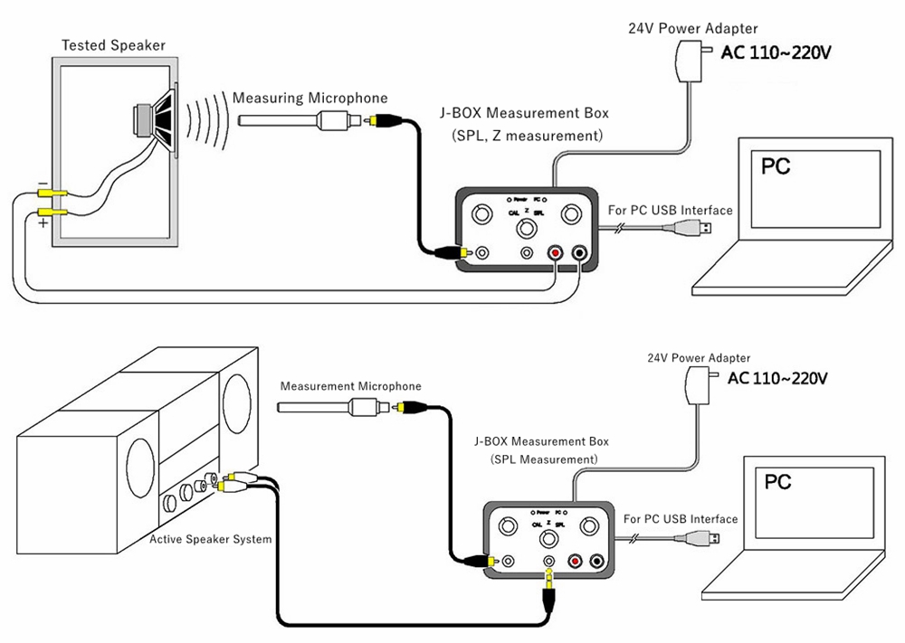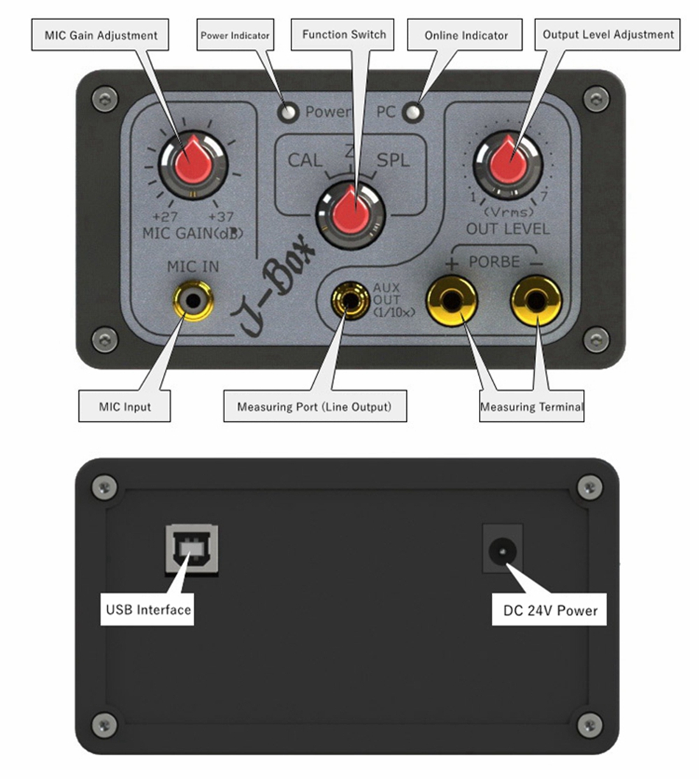 - This measurement box J-BOX greatly simplifies the operation and preparation of software and hardware. It integrates the original required equipment and complex connection, switching, debugging and other work into a box (including sound card, power amplifier, microphone amplifier). Only one knob can complete the switching.