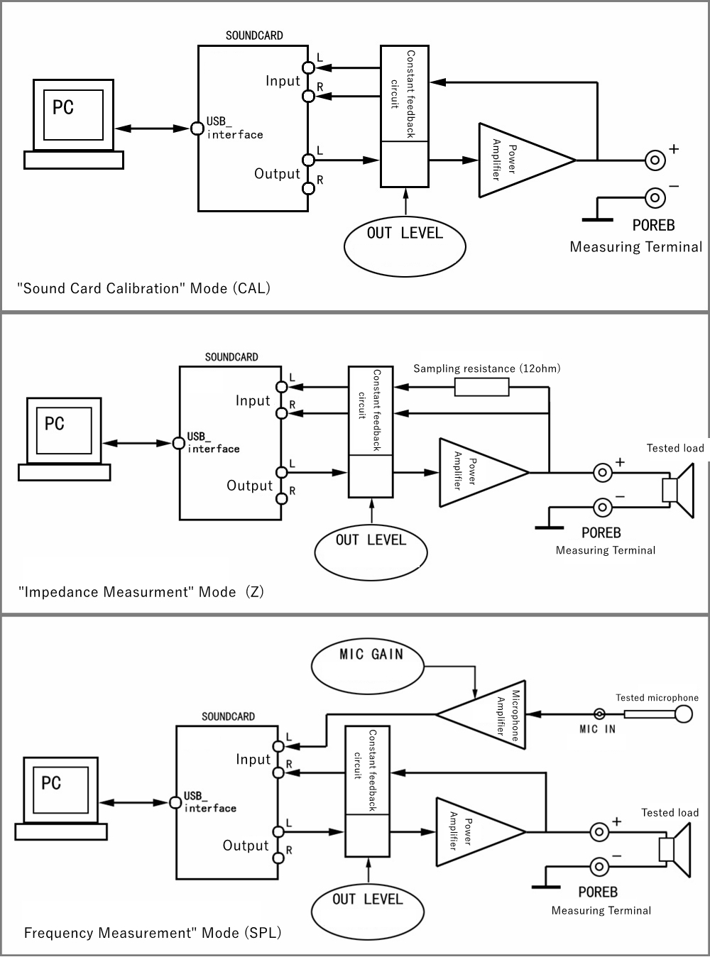 - The principle framework of this device is roughly as shown in the following figure (respectively, the working modes of "sound card calibration", "impedance measurement" and "frequency response measurement"). This mode can support a variety of audio measurement software.