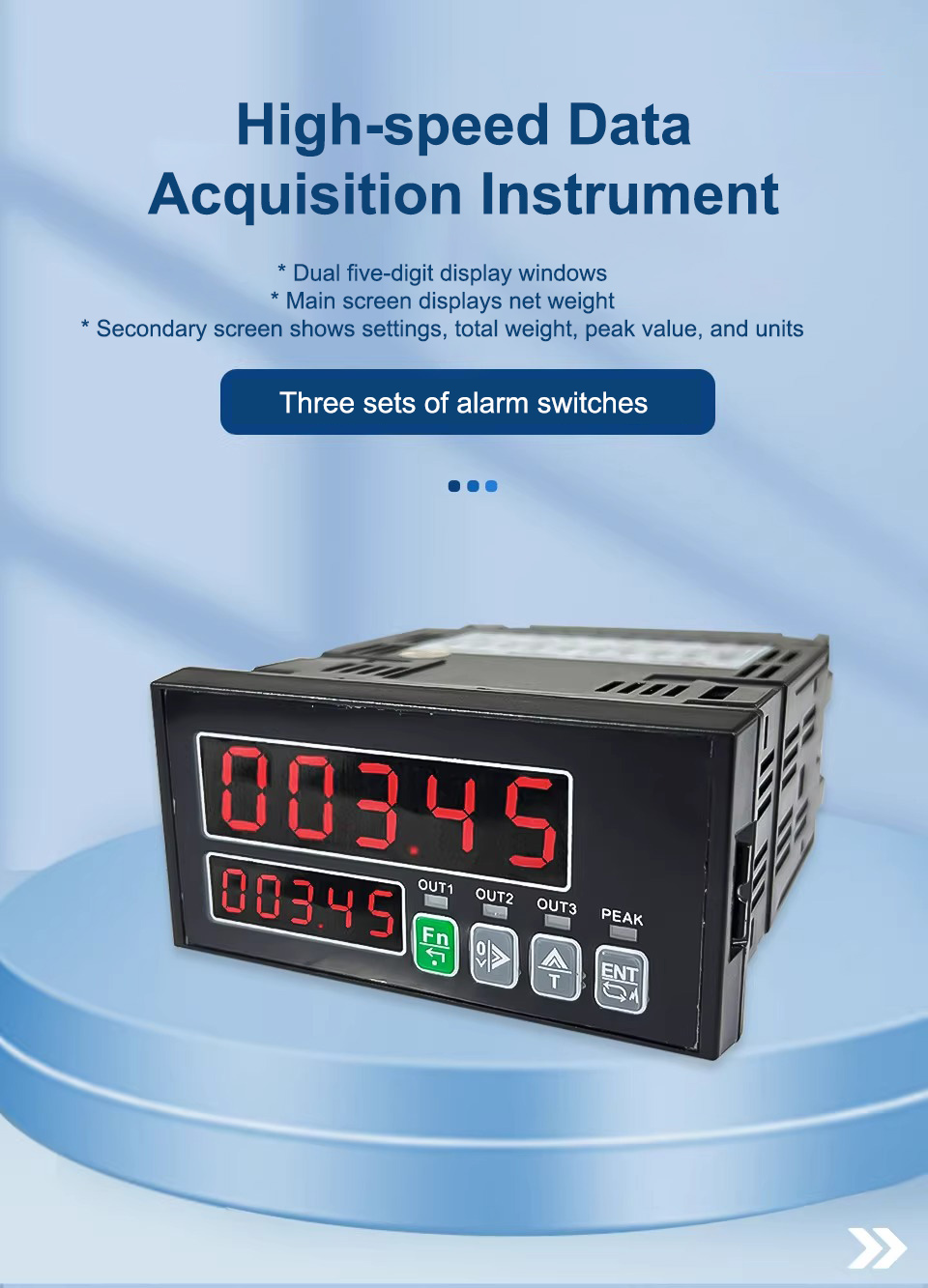 KV-4A is a high-speed data acquisition instrument featuring dual five-digit display windows. The main screen displays net weight, while the secondary screen shows settings, total weight, peak value, and units. This weight indicator is equipped with three sets of alarm switches.