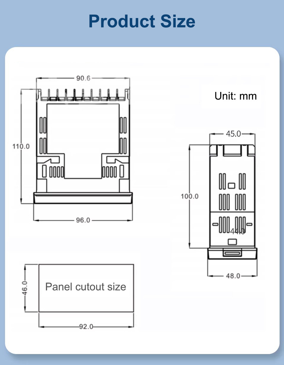 * Dimensions: 96 × 48 × 110 mm (Panel cutout size: 92 × 46 mm)