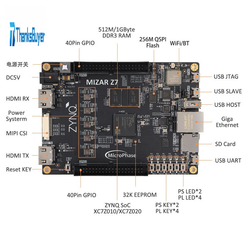 - LEDs: 2 system LEDs, one of which for power supply and the other for download status; 6 user LEDs, including 2 LED for PS side and 4 LED for PL side