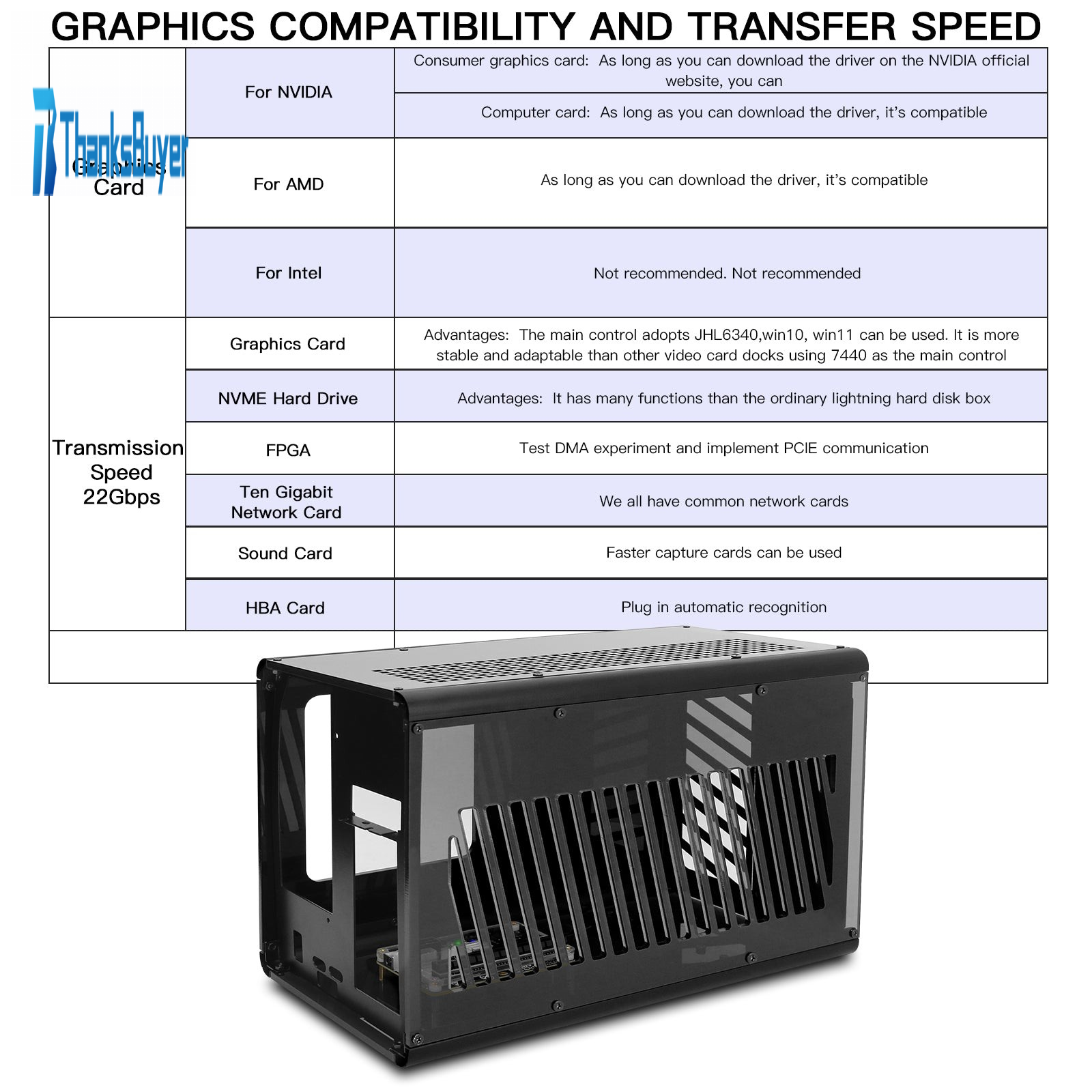 Our graphics card dock adopts JHL6340 and its transmission speed is about 2750MB/s, 2750*8/1024=21.5G. It can be used on both systems for Windows 10 and Windows 11.