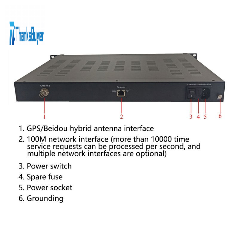 - Its rear panel with antenna port for GPS/Beidou, 100Mbps network port, switch, spare fuse, socket and grounding terminal