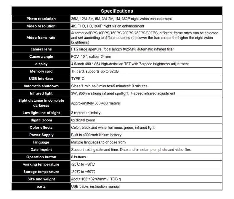 - Video resolution: 4K, FHD, HD, 480P night vision enhancement