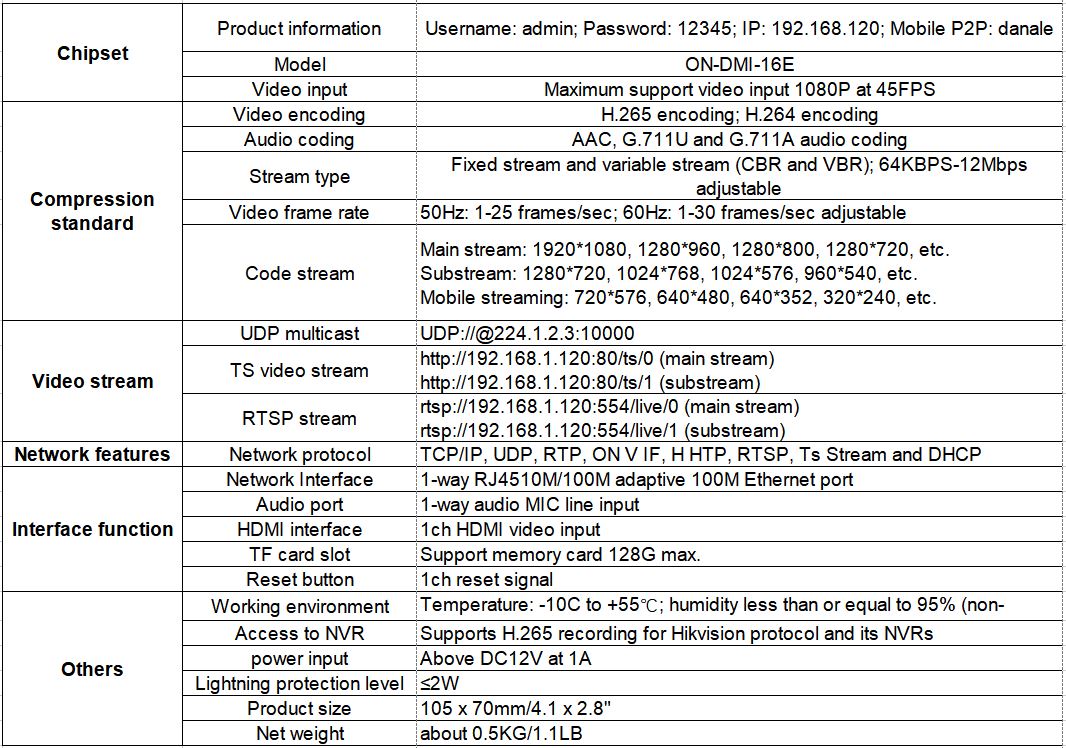 - Push stream: RTMP protocol; Pull stream: TS stream (support H.265 encoding); Support UDP multicast; Support VLC player
