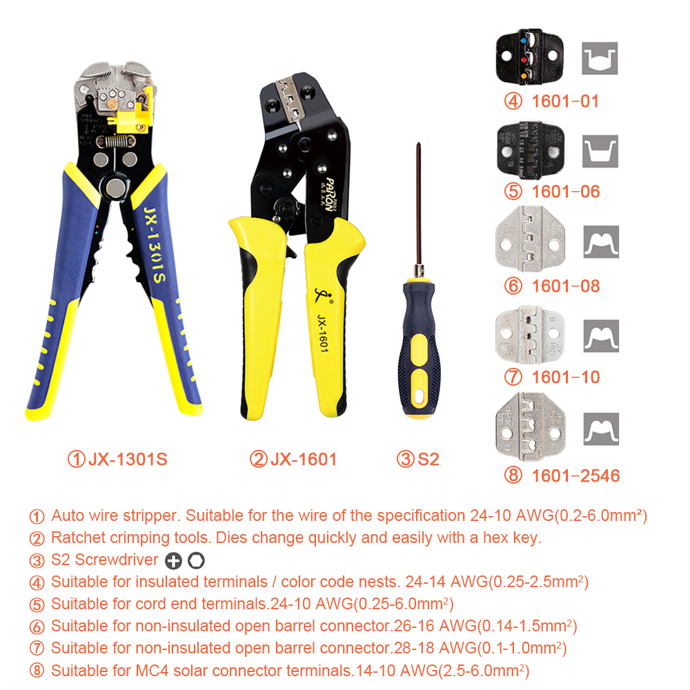The 5 in 1 crimping tool set (with wire stripping pliers) (JX-D53015) is made of imported manganese steel, with high durability, long service life and easy to use. The clamp head is maded by high-precision powder metallurgy, featuring high accuracy. The tool kit can be used to crimp terminals of different specifications and models, and is equipped with multifunctional automatic wire strippers and a dual-purpose screwdriver for changing the die. It can cut various wires and copper wires, which is a set of highly practical and professional crimping tools.