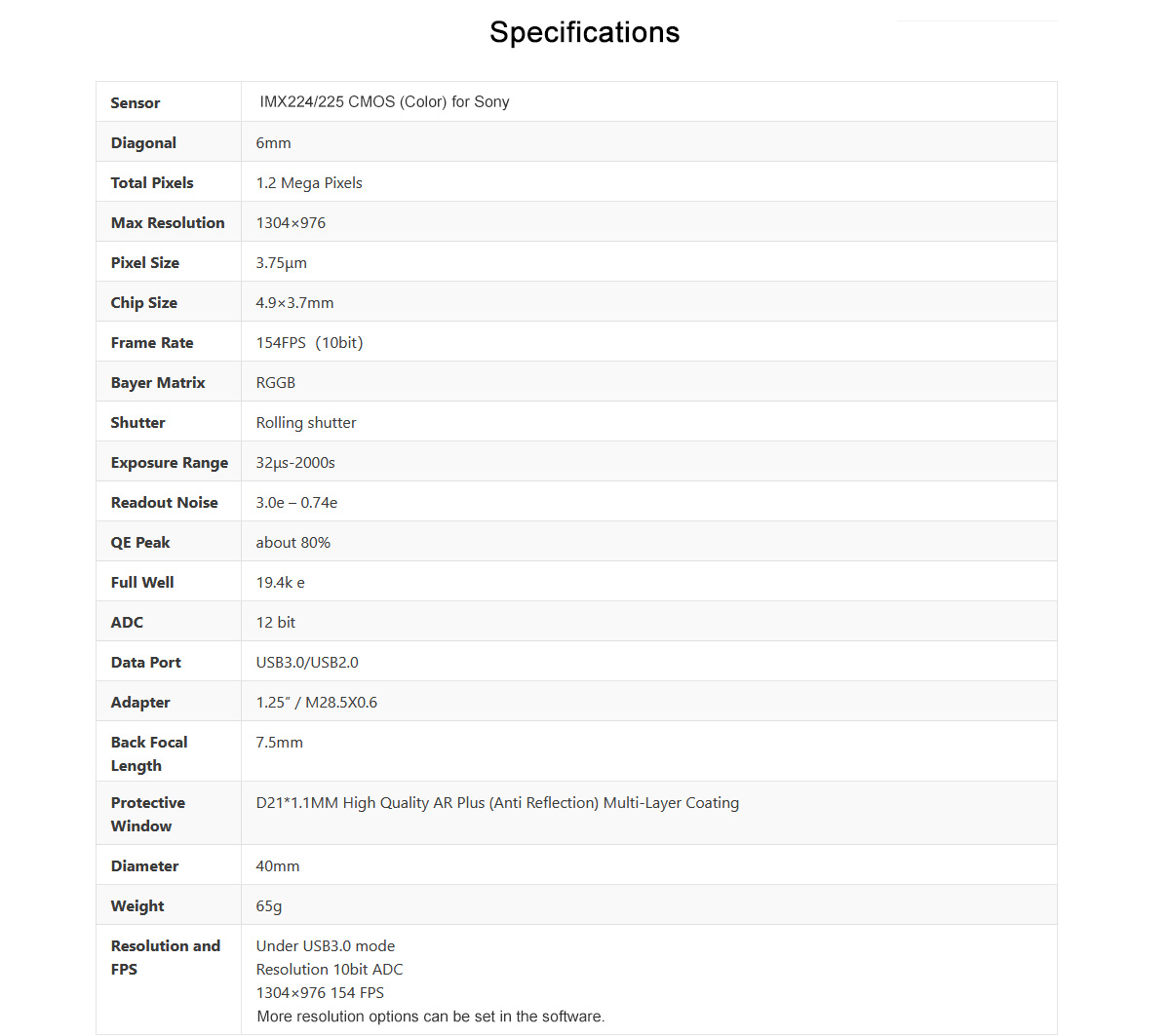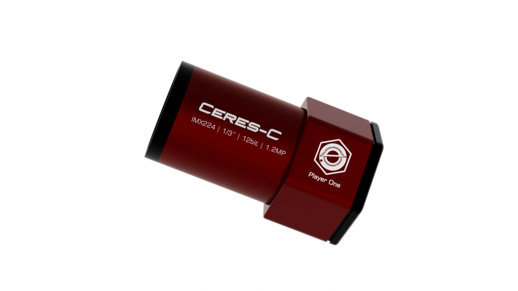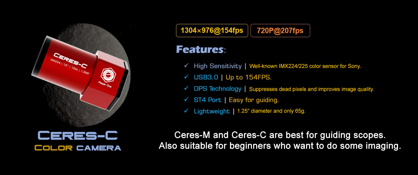 Ceres-C is a guiding camera developed by Player One Astronomy. It adopts the IMX224/225 1/3" format sensor for Sony. The 3.75um pixel size accommodates a well depth of 19.4ke with a total of 1.2MP (the resolution is 1304*976), and the diagonal is 6mm.