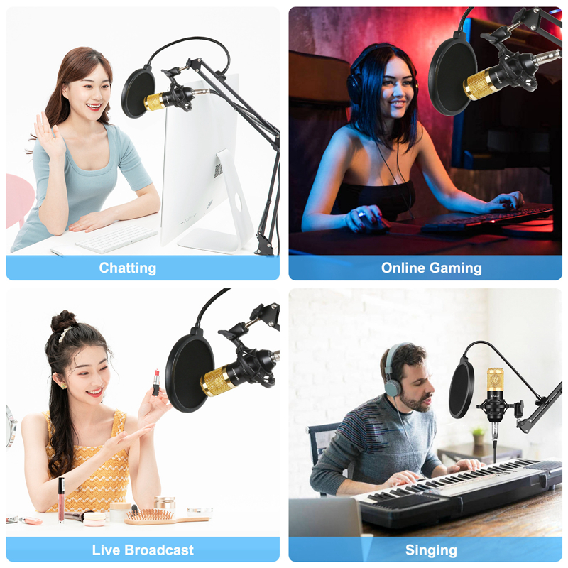 1. Professional recording studio equipment: Professional recording studio equipment: Equipped with this microphone, shock mount, pop filter, mic adjustable suspension scissor arm stand, anti-wind foam cap, power cable, sound card