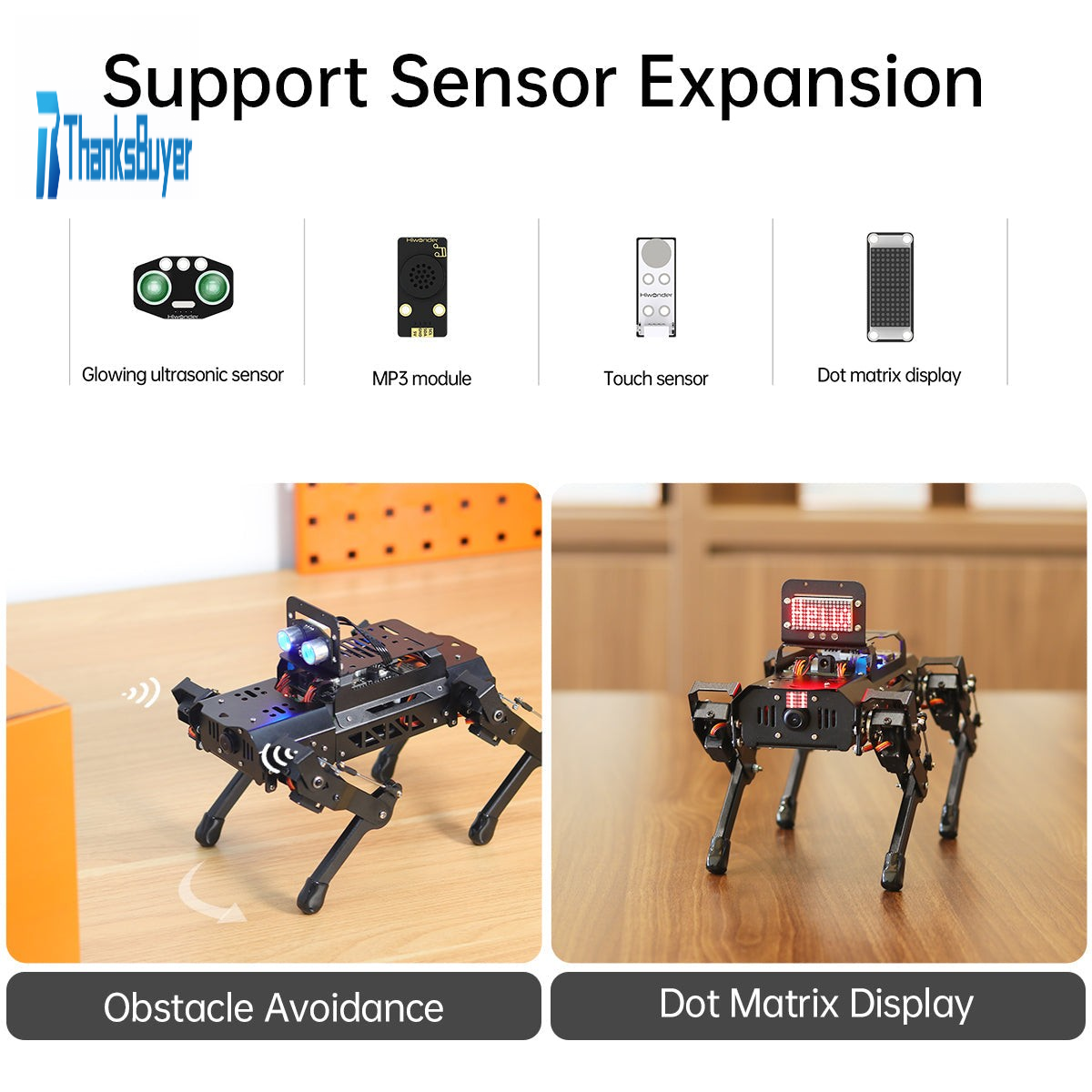 - PuppyPi is compatible with MP3 module, touch sensor, dot matrix display, ultrasonic sensor and other modules making it possible to build more creative AI projects.