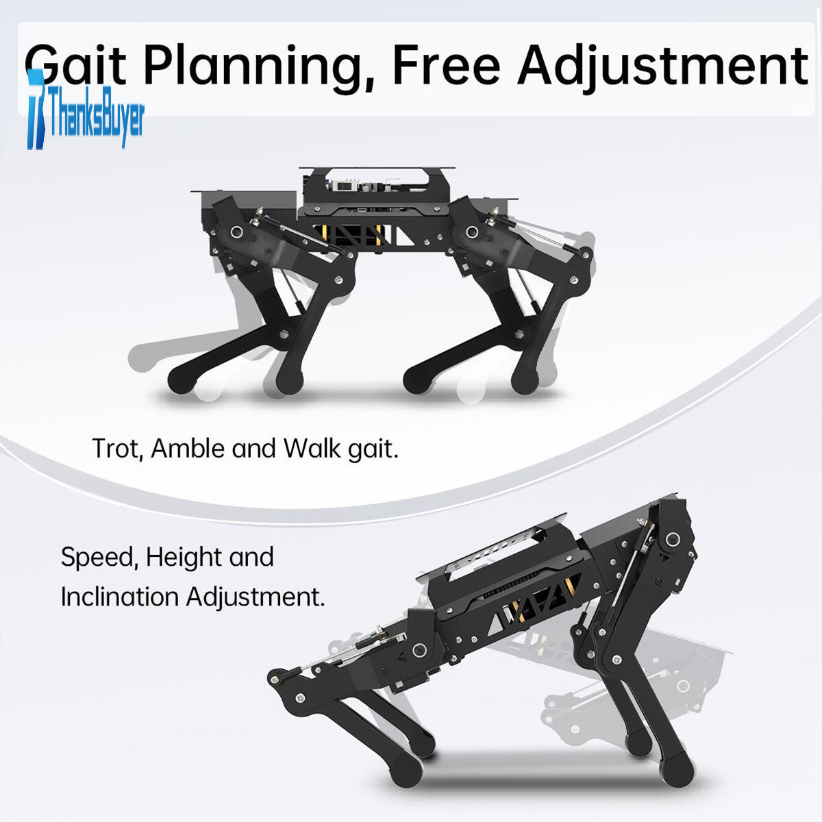 - Walk, Amble and Trot gaits can be realized through adjusting touchdown time, lift time and lifted height of each leg as well as the speed of switching front legs and hind legs.