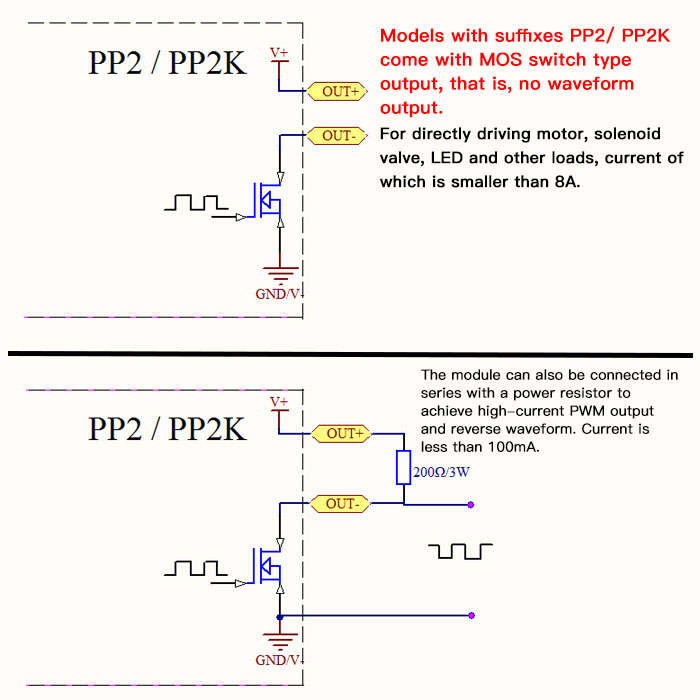 Attention: High-power PWM driver (models with suffixes PP2/ PP2K) has no waveform without a load. There is a waveform only after connecting to a load. Internal schematic is shown below: