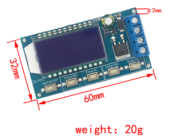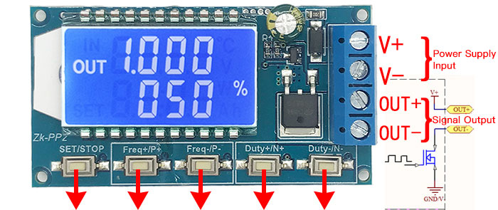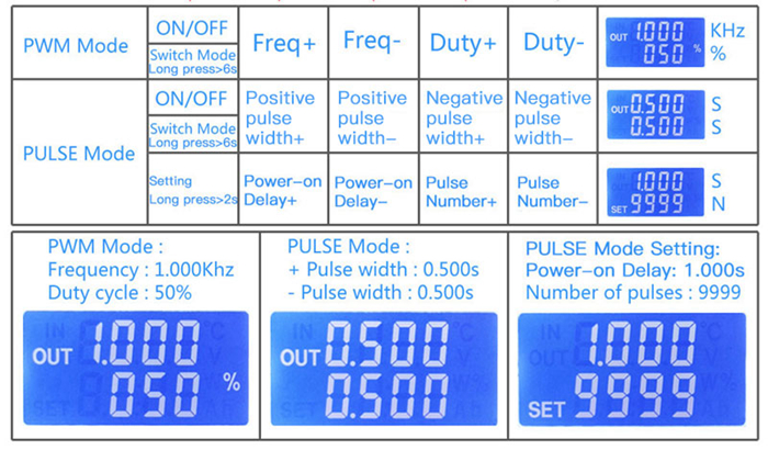 By buttons P + and P-, you can set positive pulse width time which is displayed on the top line in LCD screen. Press N + and N- buttons to set negative pulse width time, which will be displayed on the lower line in LCD screen, with unit in seconds. Short press button STOP to control signal to output or stop. Output is 0 when stopped. The module has output when the screen displays OUT. Otherwise, output is stopped. Default positive pulse width is 0.5 seconds, and negative pulse width is 0.5 seconds.