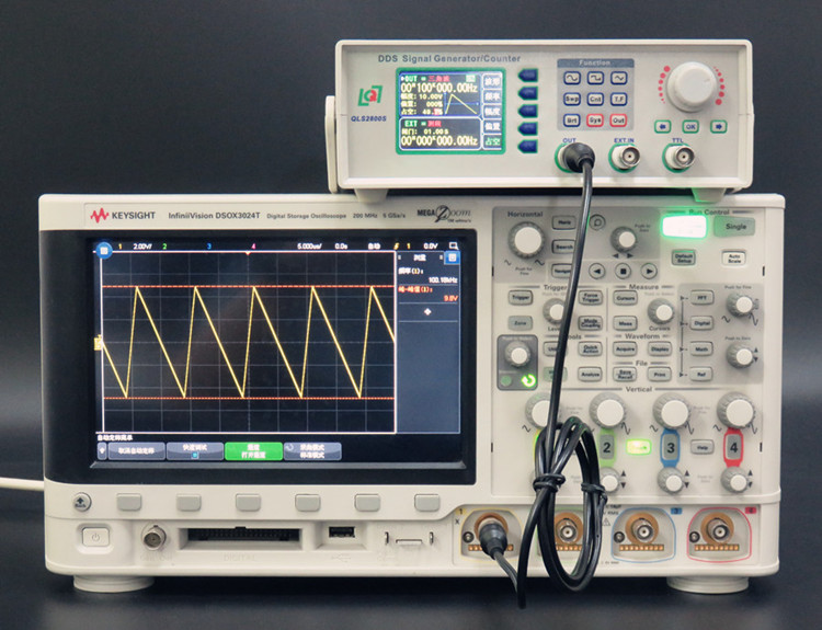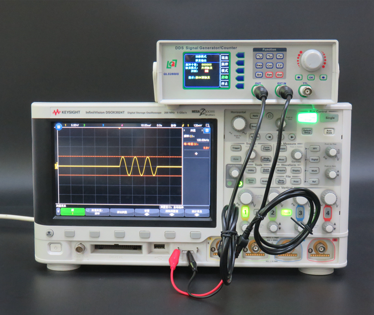 (10) External bursting function: The oscilloscope comes with a 1K square wave signal, and the external trigger function outputs three cycles of a sinusoidal waveform with a frequency of 100K.