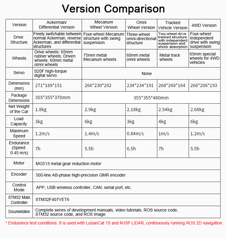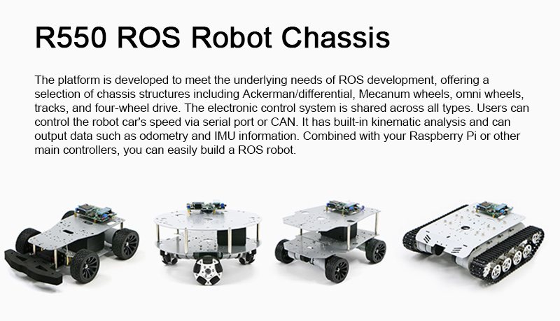 The platform is developed to meet the underlying needs of ROS development, offering a selection of chassis structures including Ackerman/differential, Mecanum wheels, omni wheels, tracks, and four-wheel drive. The electronic control system is shared across all types. Users can control the robot car's speed via serial port or CAN. It has built-in kinematic analysis and can output data such as odometry and IMU information. Combined with your Raspberry Pi or other main controllers, you can easily build a ROS robot.