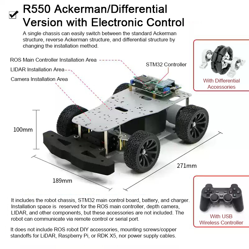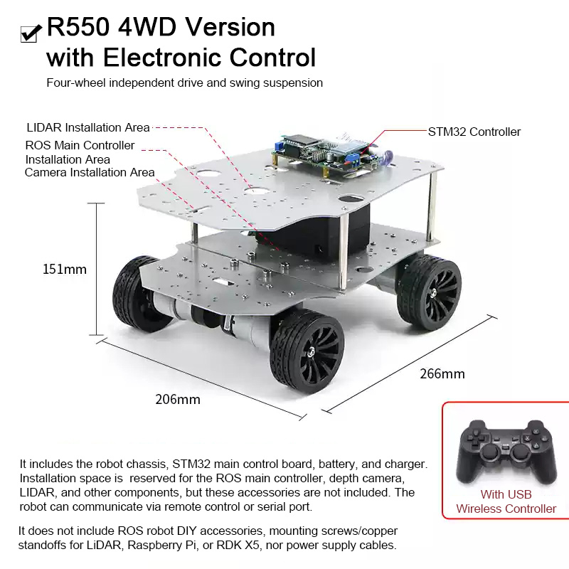 * Reserved USB wireless controller receiver socket. Users can control speed and steering using the USB wireless controller, with the joystick allowing for continuous speed adjustment.