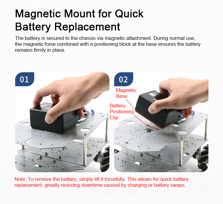 * The battery is secured to the chassis via magnetic attachment. During normal use, the magnetic force combined with a positioning block at the base ensures the battery remains firmly in place.
