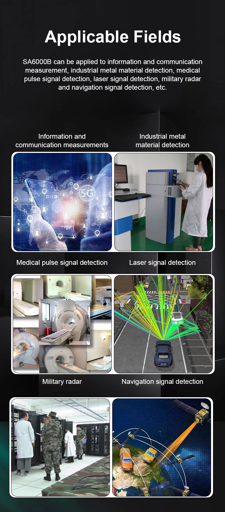 - Application: SA6000B can be applied to information and communication measurement, industrial metal material detection, medical pulse signal detection, laser signal detection, military radar and navigation signal detection, etc.