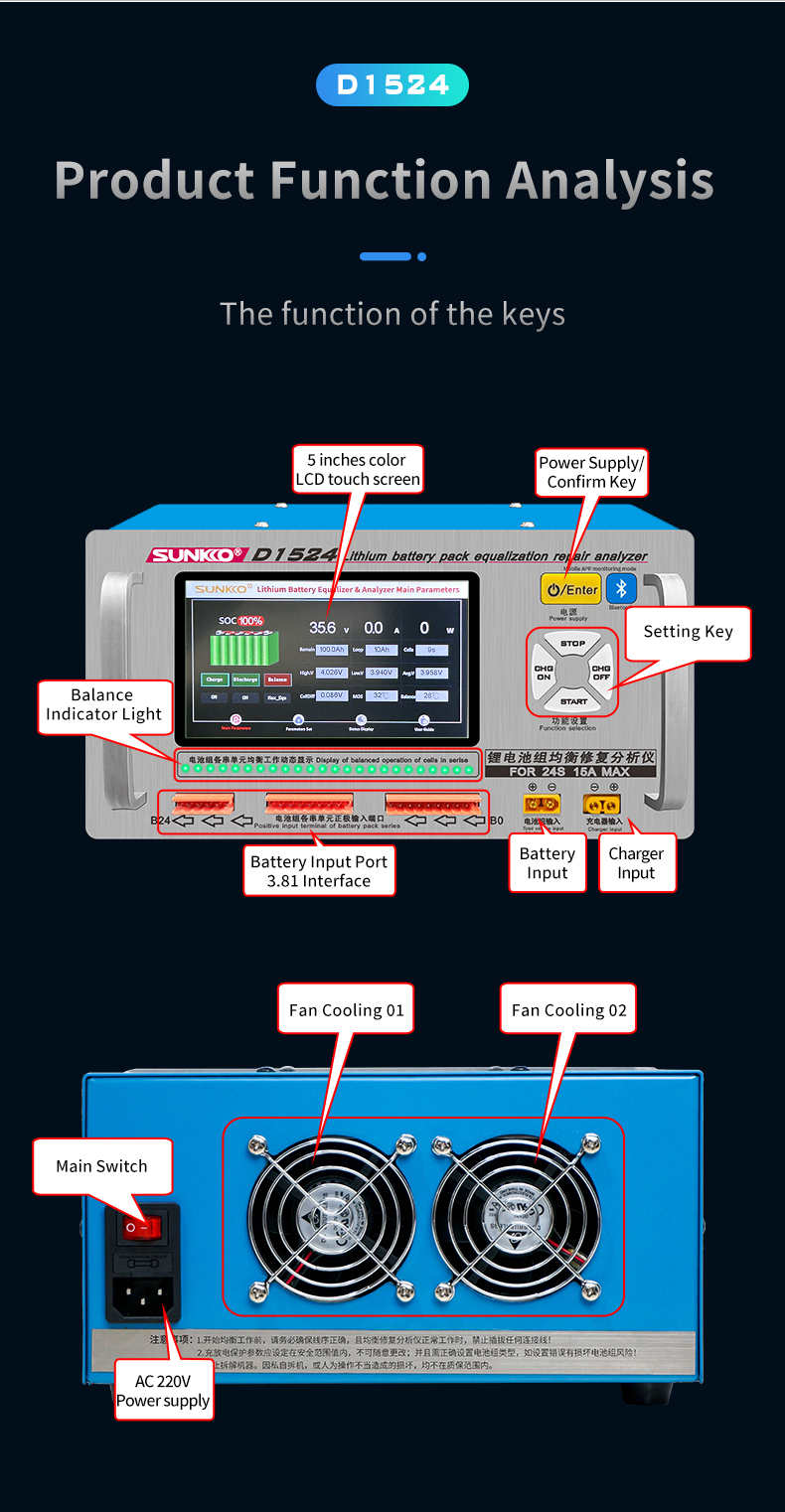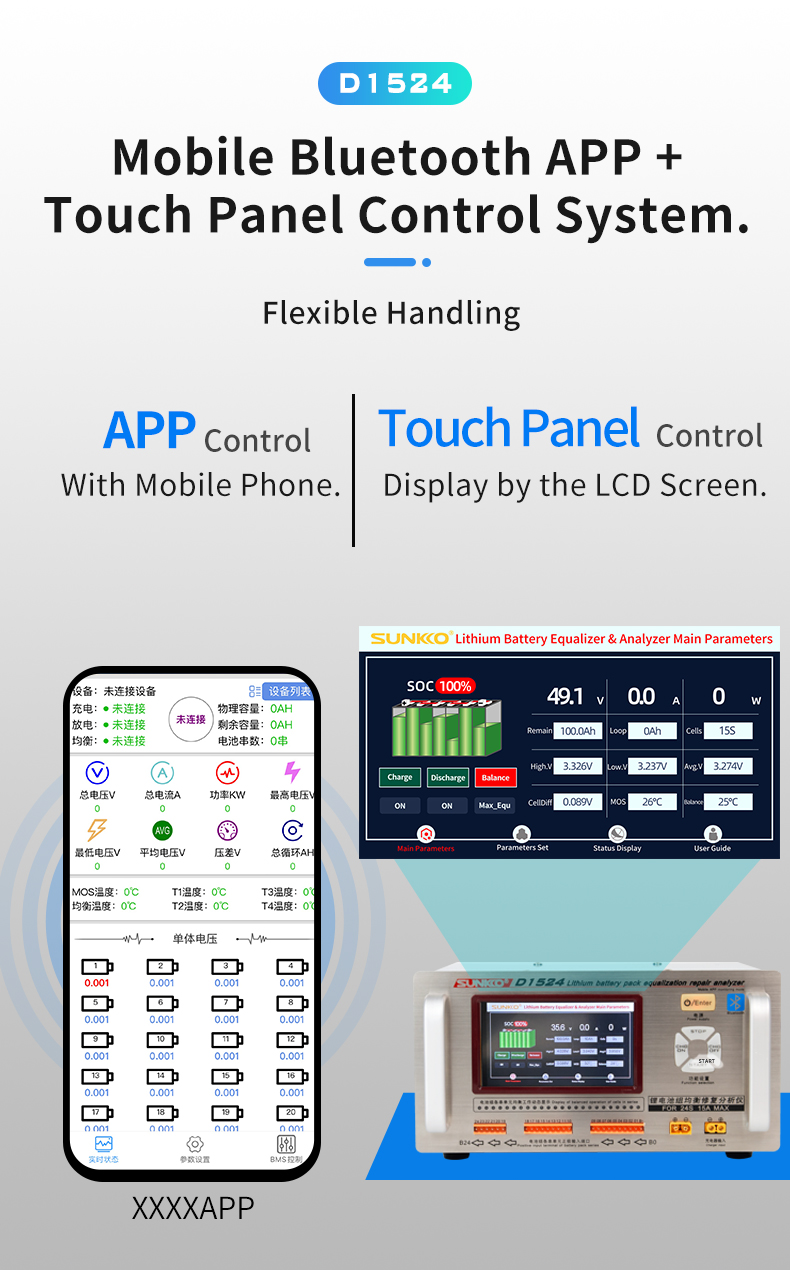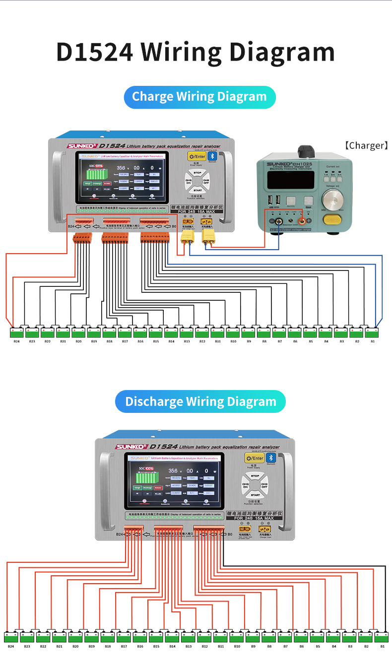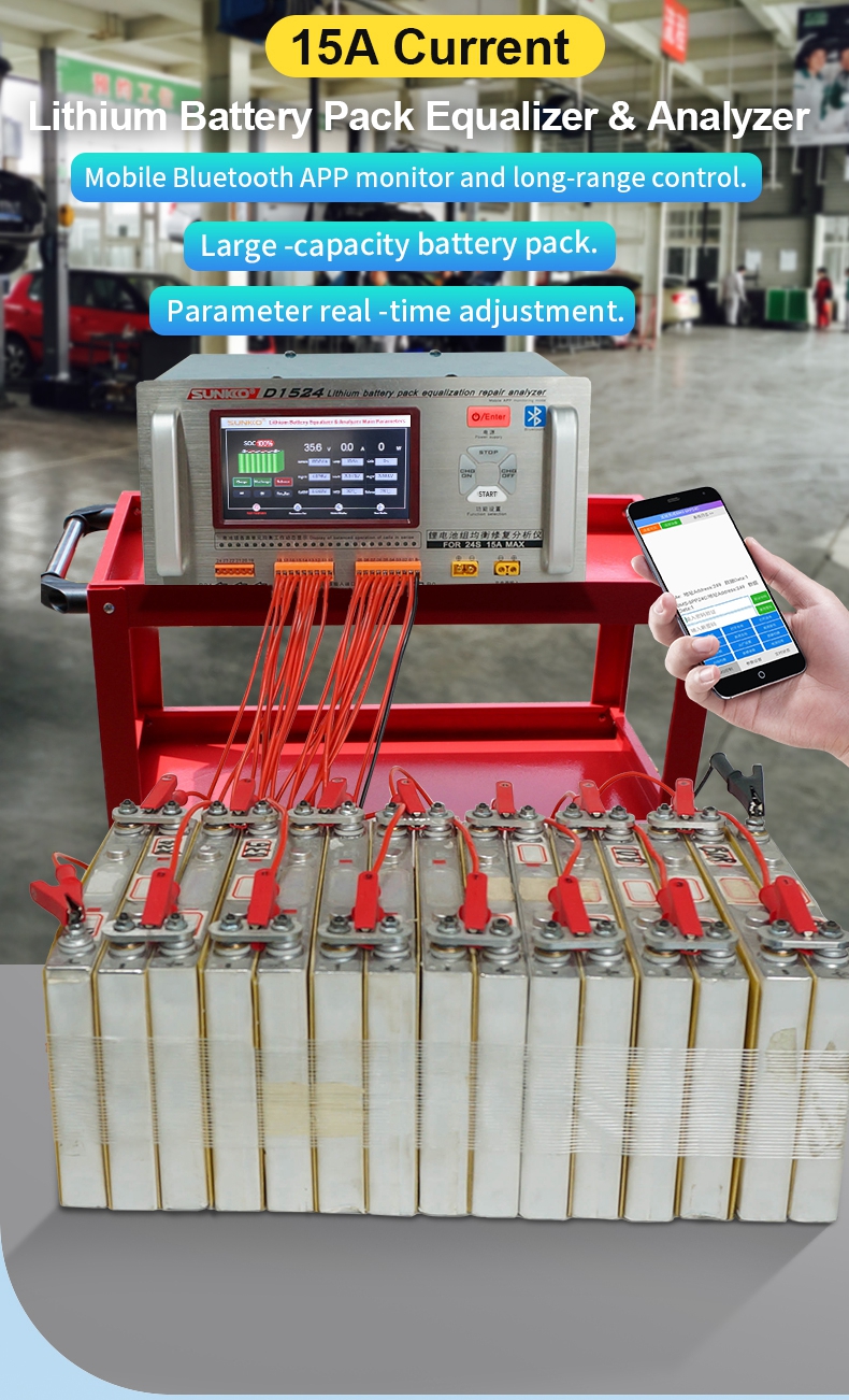 SUNKKO D1524 Lithium Battery Equalizer and Analyzer 5-inch Color LCD Touch Screen Support Bluetooth Control