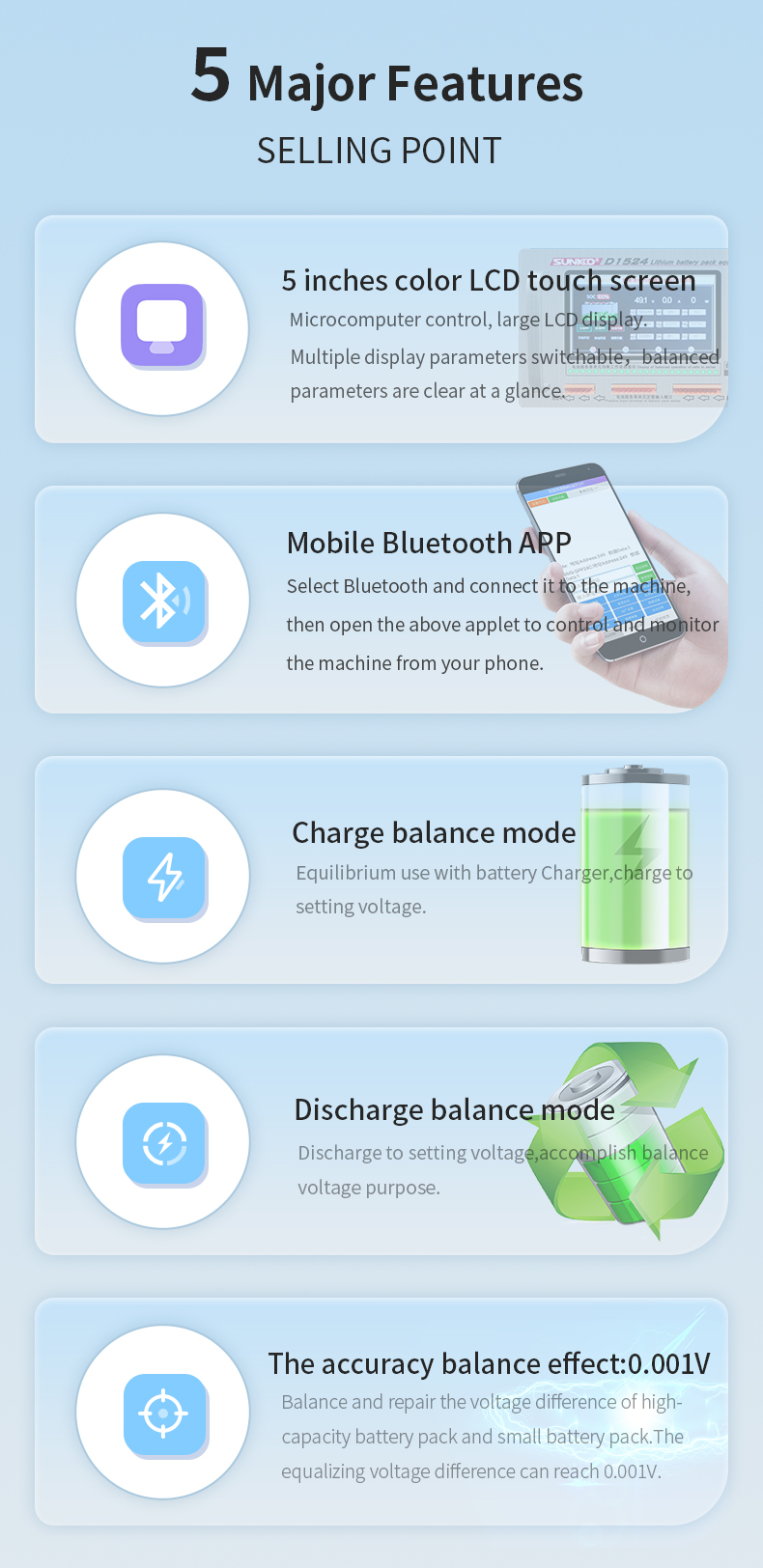 - The accuracy balance effect: 0.001V; balance and repair the voltage difference of high-capacity battery pack and small battery pack. The equalizing voltage difference can reach 0.001V.