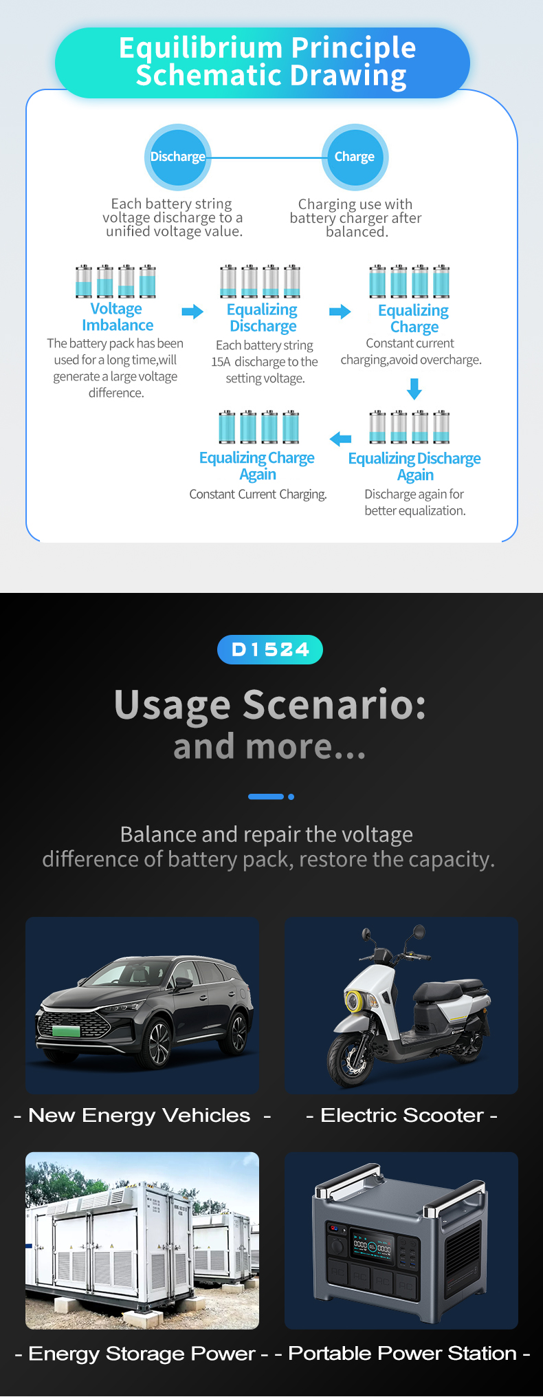 - Balance and repair the voltage difference of battery pack, restore the capacity.