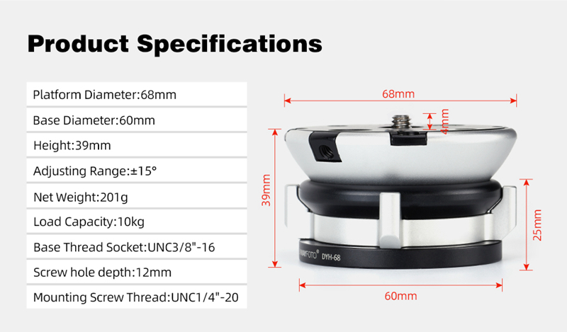 - Using two 1/4 camera screws, can be installed onto the top of indexing rotator DDP-64M/DDP-64S and leveling base DYH-90/DYH-90R for mounting camera quickly and conveniently