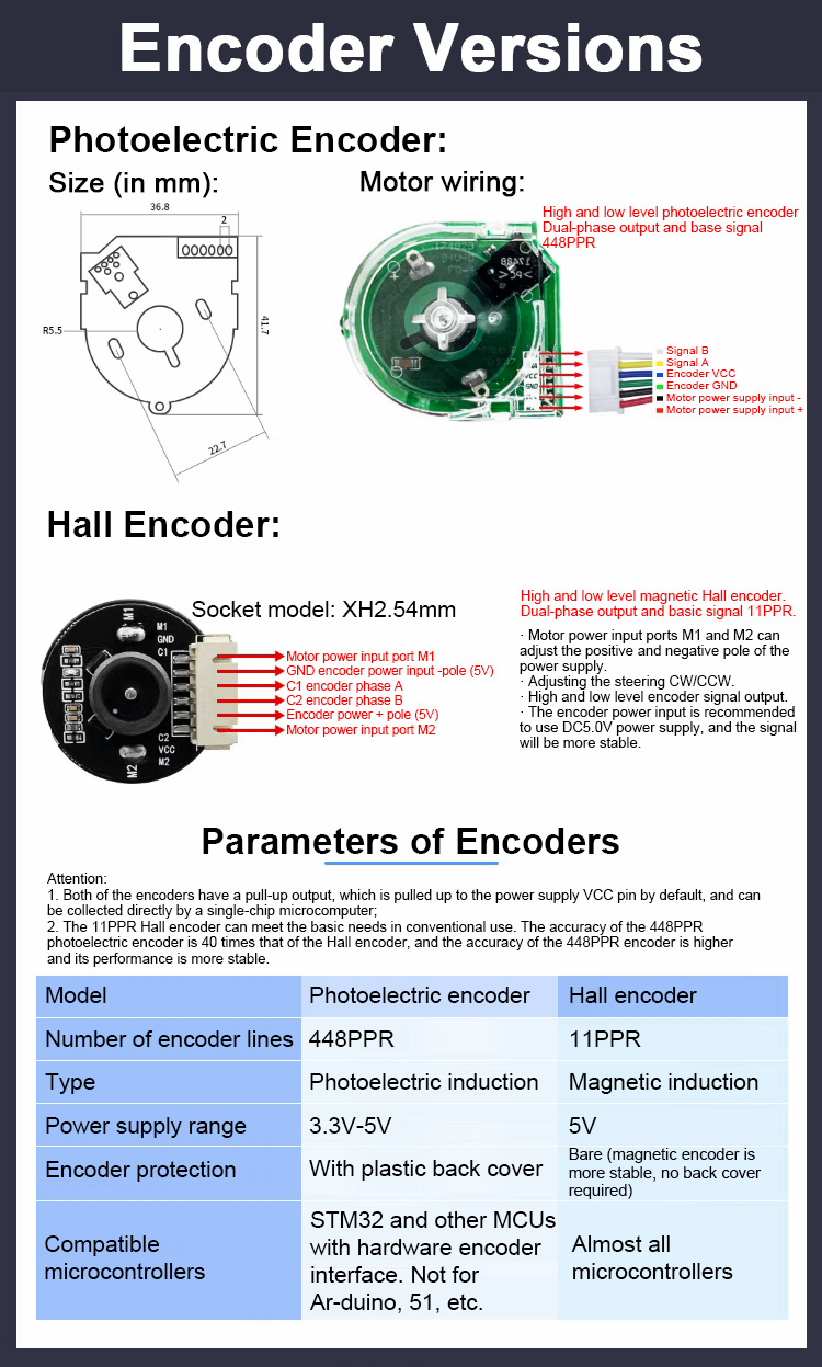 4. Encoder versions: 11PPR Hall encoder can meet the basic needs of conventional use, and the accuracy of the 448PPR photoelectric encoder is 40 times that of the Hall encoder. The 448PPR encoder is more accurate and stable.