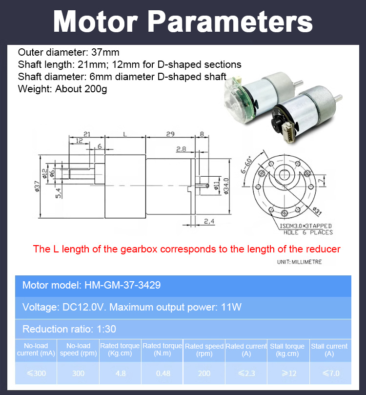 - Motor: 12V DC geared motor (37 motors with encoding disk and 1:30 reduction ratio)