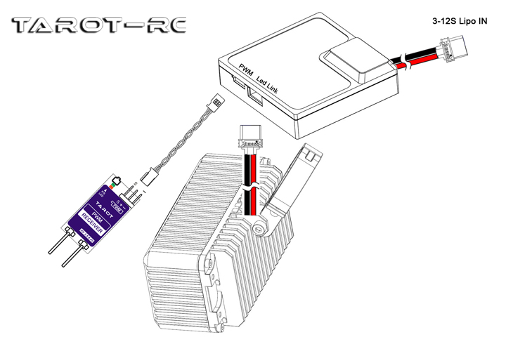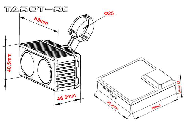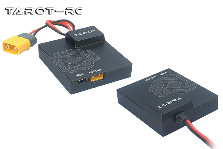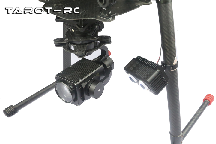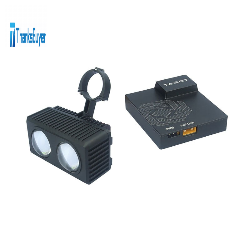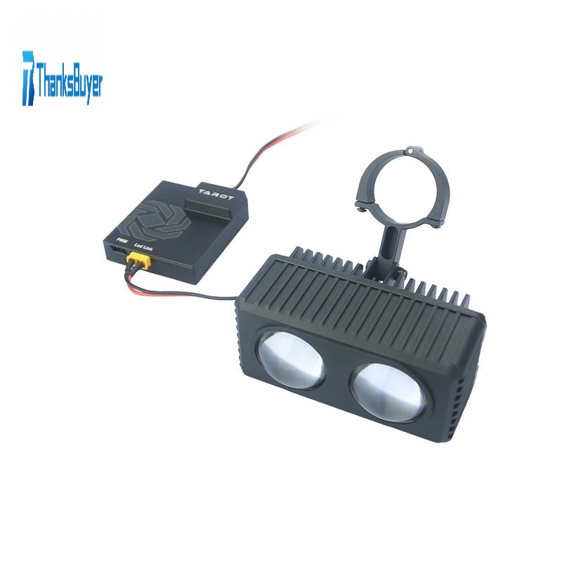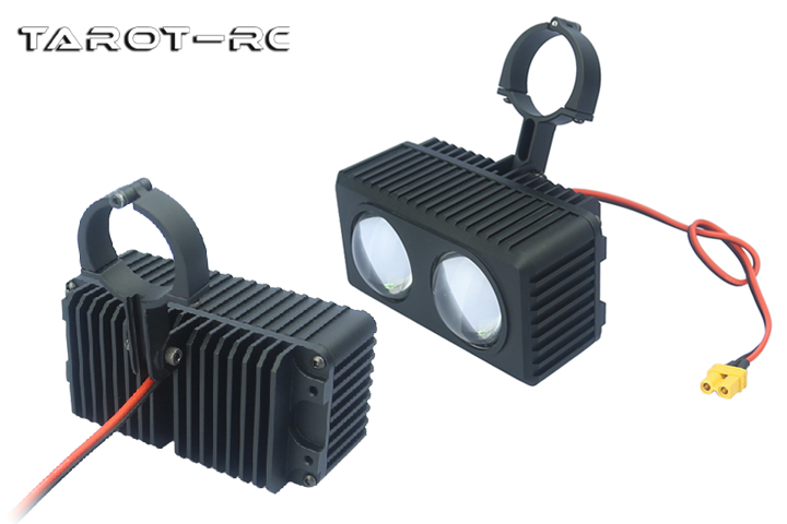 The electrodeless searchlight produced by Tarot adopts double lamp bead components, and the irradiation angle is 15 degrees. When the maximum power is 60W, the central illuminance value of the spot at a distance of 50m/164ft reaches 24 lux; the effective irradiation area reaches 600 square meters at an irradiation height of 80m/262.5ft. This searchlight uses PWM signal to control stepless dimming and flashing functions. It adopts ultra-light design and weighs 203g/0.4lb. It can be installed on the arm or tripod with a diameter of 25mm/1". It can meet the requirements of night patrol, warning drive away, orientation indication, power line patrol, search and rescue and other night operation needs.