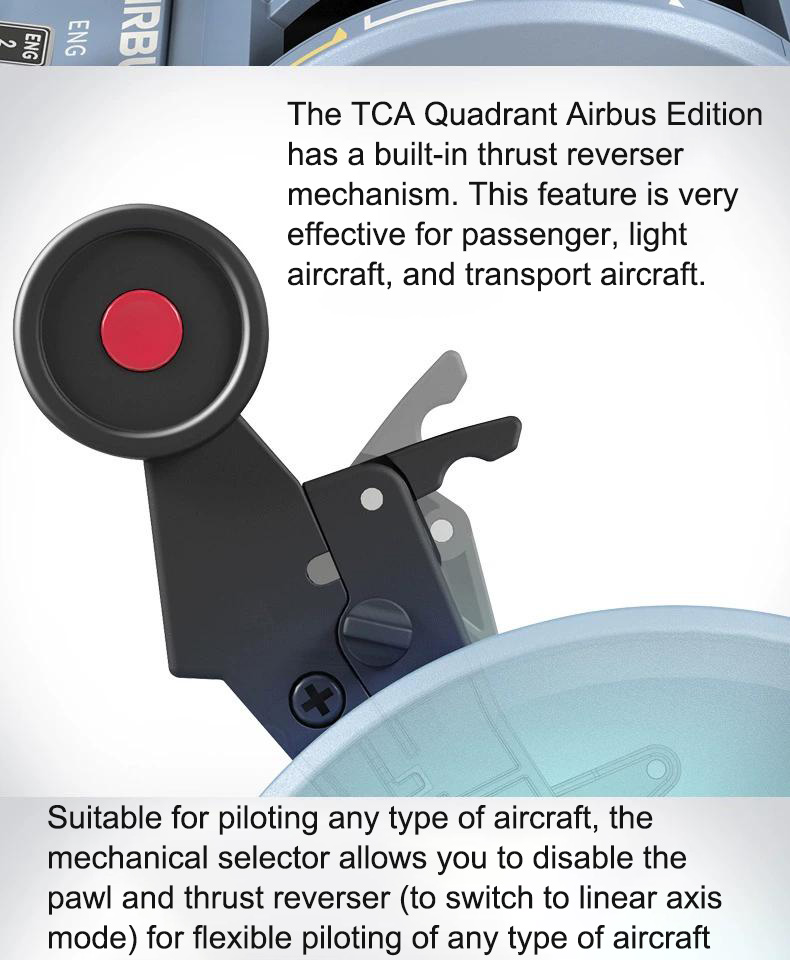 - The TCA Quadrant Airbus Edition throttle quadrant features functional thrust reversers, replicating those found on Airbus commercial aviation throttles. You can disable the thrust reverser mechanism, for piloting better suited to civil aviation.