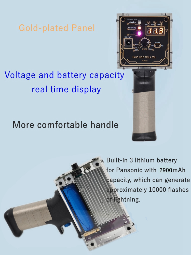 - The third generation Plus enhanced version (transparent) Tesla coil gun is equipped with a 2900mAh lithium battery for Panasonic, which can generate approximately 10000 flashes of lightning. (automatic trigger + single trigger)