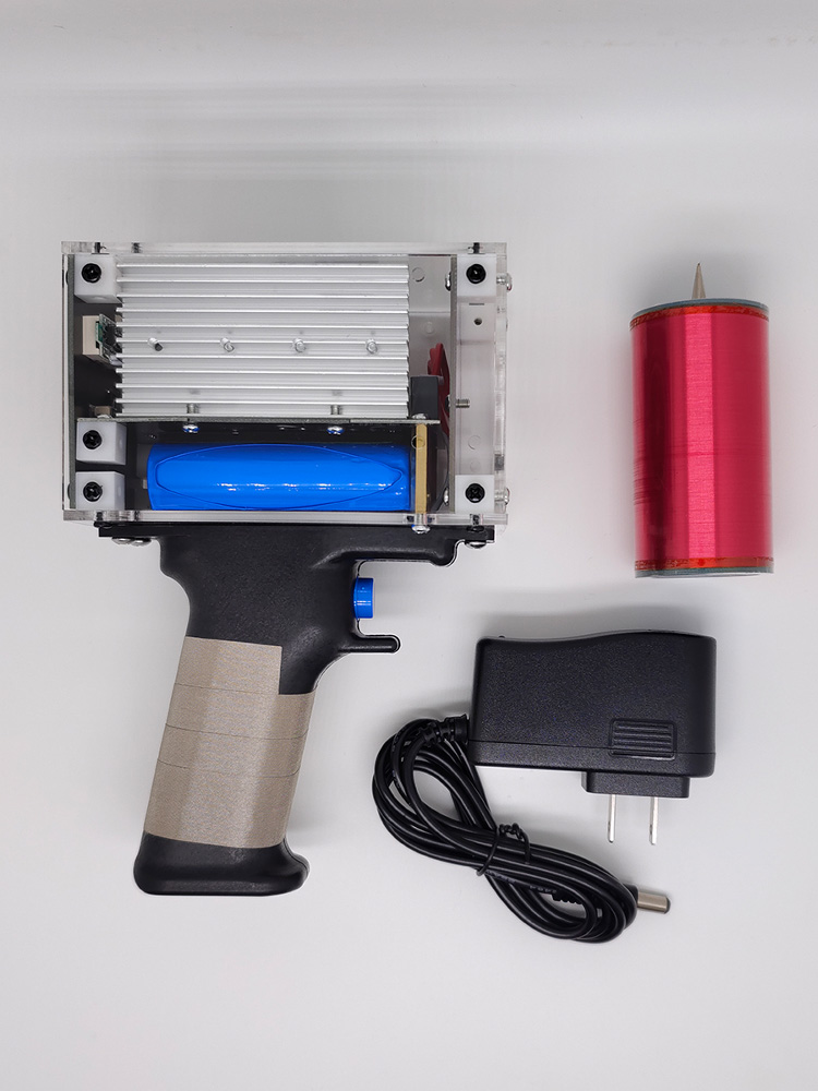 - The third generation trial version (deep grey) Tesla coil gun adopts a fully black injection molded shell, paired with a 2000mAh lithium battery, which can generate approximately 7000 flashes of lightning. This model does not have an automatic triggering function. (single trigger)