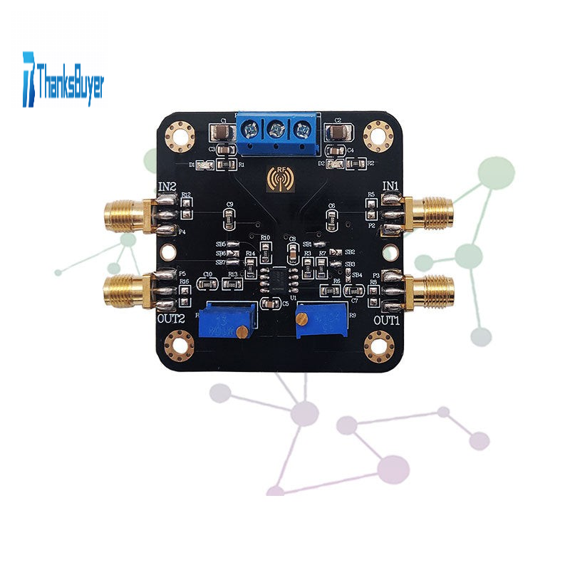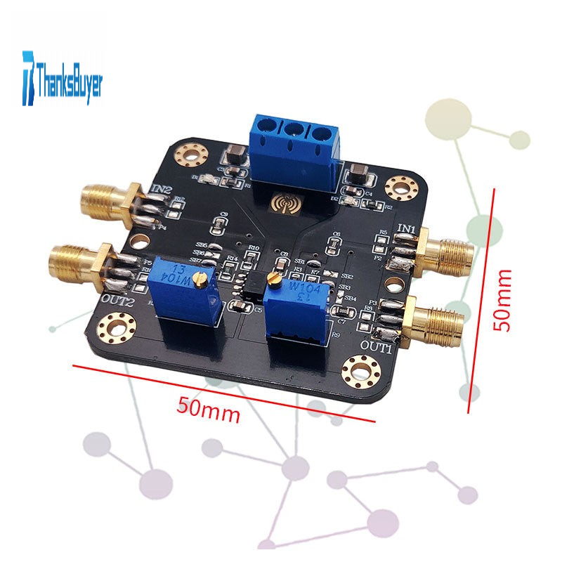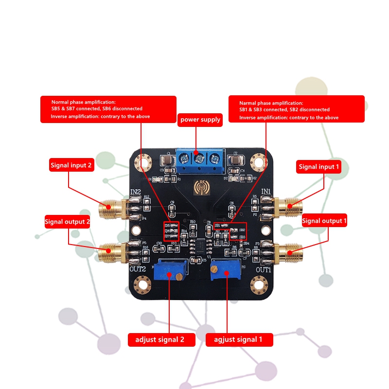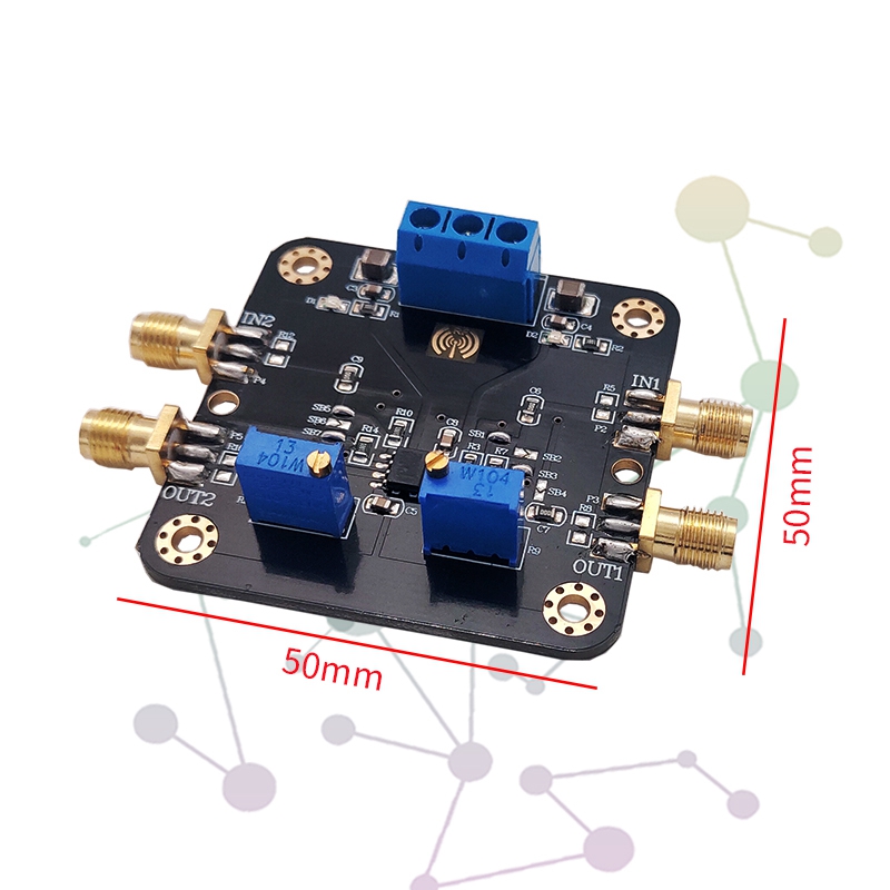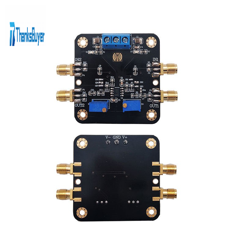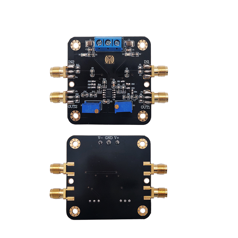 - This module is a dual channel amplifier designed for SOP-8. The function of the amplifier module is highly compatible with the chip model. It is basically applicable to most of the SOP8 series dual op amp chips on the market, and is very convenient to use. The input and output of signals are all coaxial SMA high-frequency connectors, which can reduce the loss amplitude of signals and shield the interference of other signals. At the same time, the on-board circuit can be changed into in-phase, reverse phase, cascade and other functions according to the needs of users. The module uses in-phase proportional amplification circuit, and the on-board variable manual potentiometer is used to adjust the amplification. The PCB board is compatible with the RF type dual op amp. The routing and design are in accordance with the RF wiring standards, and is compatible with low-frequency signals. Modules are both functional and practical after a lot of chip verification and practice.