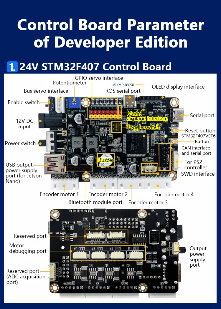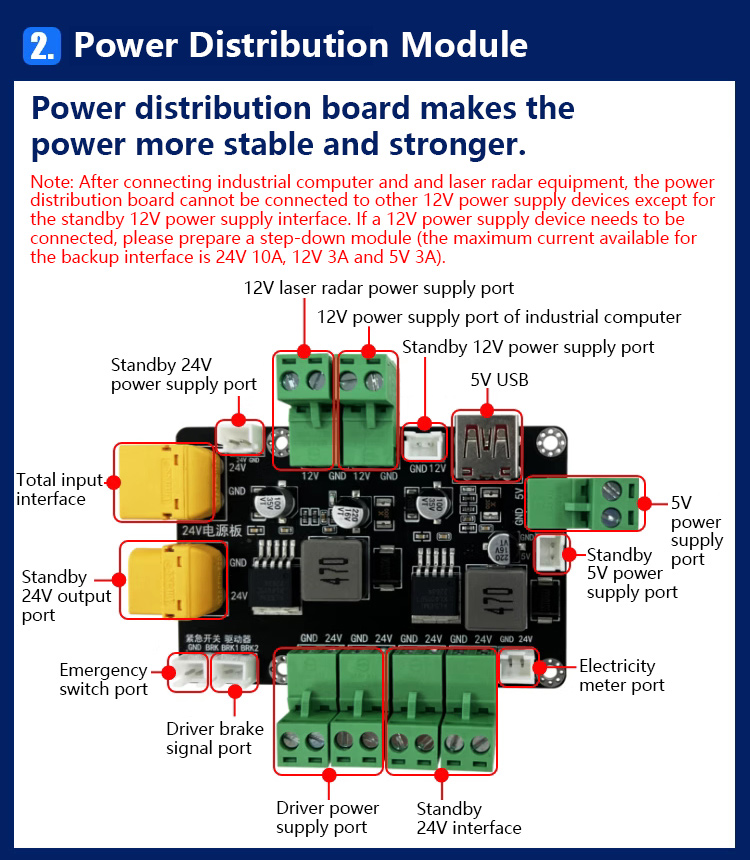 4. Provide power distribution board, reserved 5V, 12V and 24V power supply interfaces.
