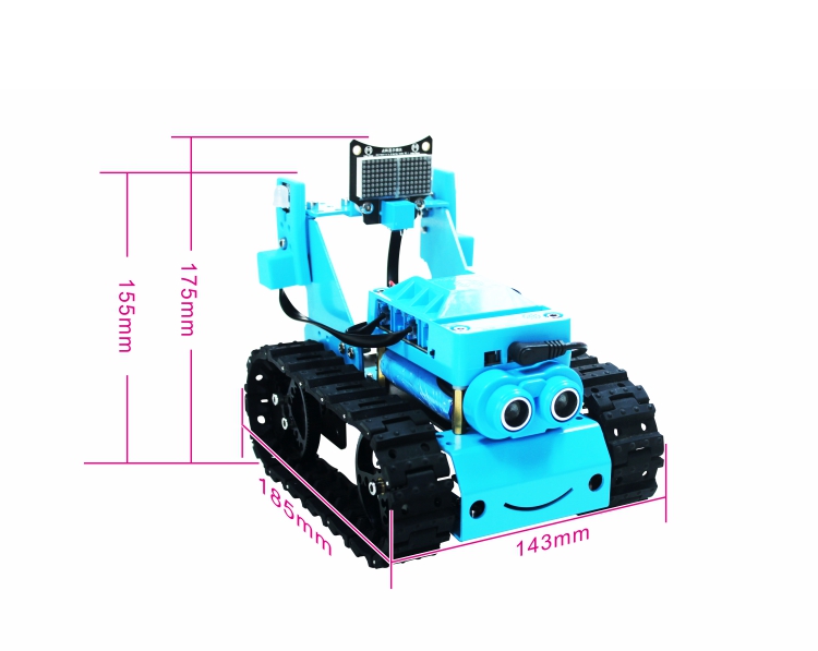 - Various fun games. Automatic obstacle avoidance function: the obstacle information is fed back through ultrasonic ranging sensor, so as to realize the automatic obstacle avoidance function. Tracking function: Automatically recognize black line through the tracking sensor and follow the black line to realize automatic walking. Walking in the wild: Tracks allow the robot to complete climbing and other actions on more complex terrain. Colorful RGB lights: Through the programming program, multiple colors of lights can be set to display circularly. Dot matrix display interactive multiple play: You can DIY fun texts, let you add more fun when operating. Robot mobile phone interaction: Through APP control, the car can complete the actions of turning, rotating, advancing and retreating.