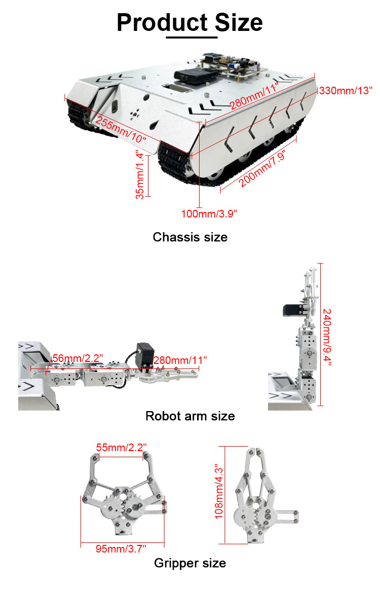 - Control mode: Wireless controller for PS2, Bluetooth APP (optional; for Android cellphones), serial port command of the host computer, etc.