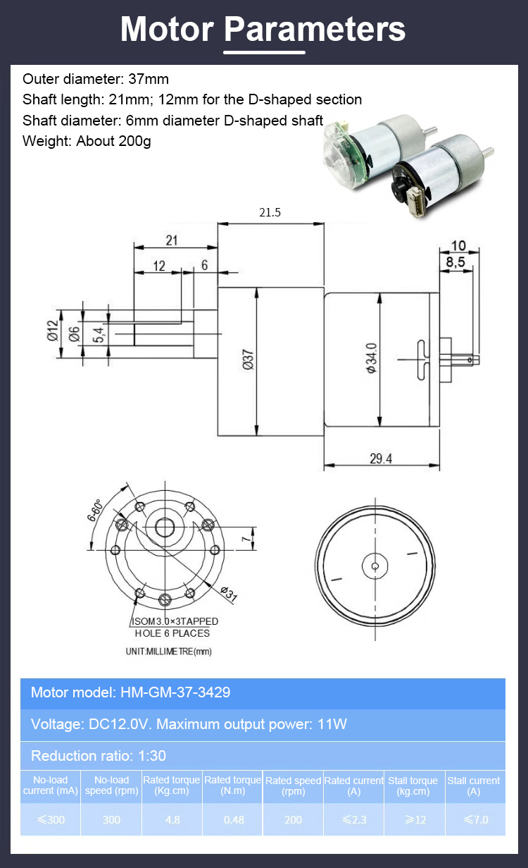 - 37 motor reduction ratio is 1:30 by default. If you need other reduction ratios, please contact customer service.