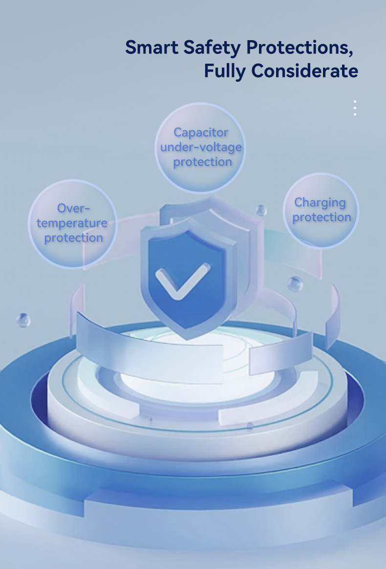 - Safety protection: capacitor low-voltage protection, capacitor charging protection, over-temperature protection