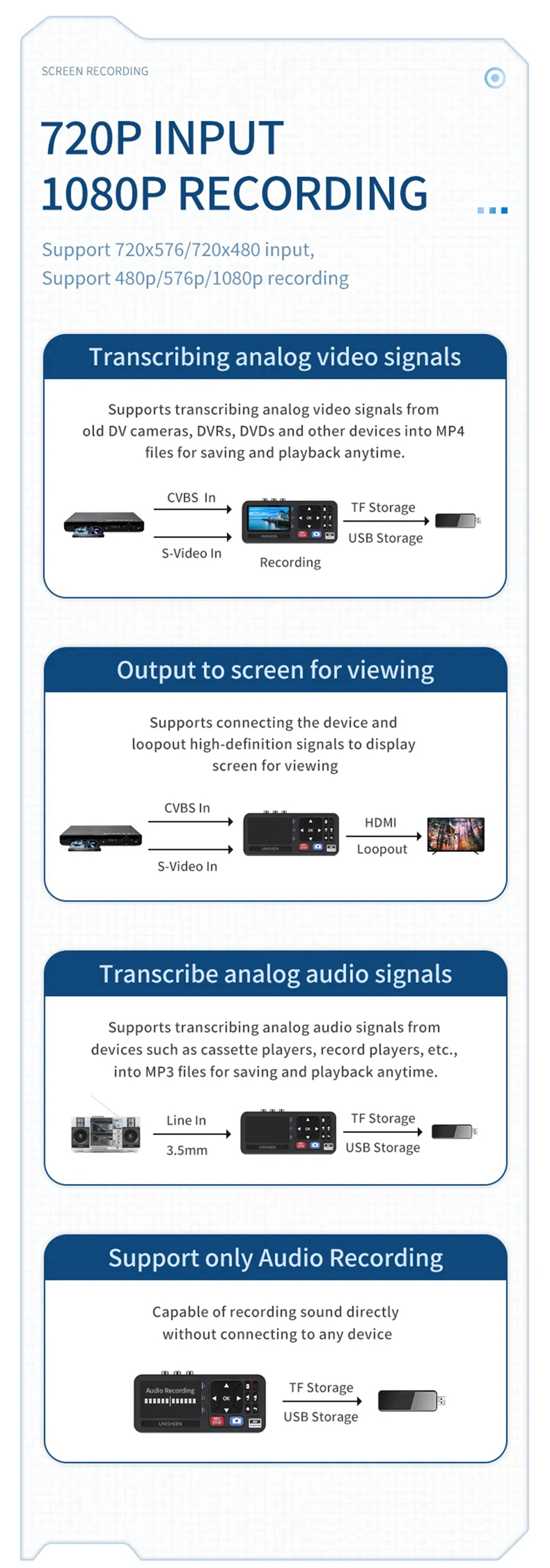 As a video recorder, it easily records audio and video from any devices which has CVBS / S-Video output (RCA/AV output), such as a VCR, VHS, Camcorder, RCA and DVD player.