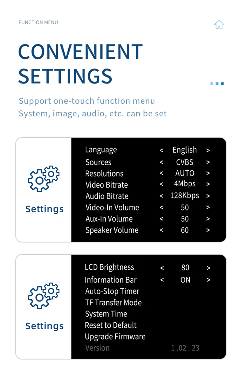 * Storage Device: Flash USB Drive (up to 512G), TF Card (up to 512G)