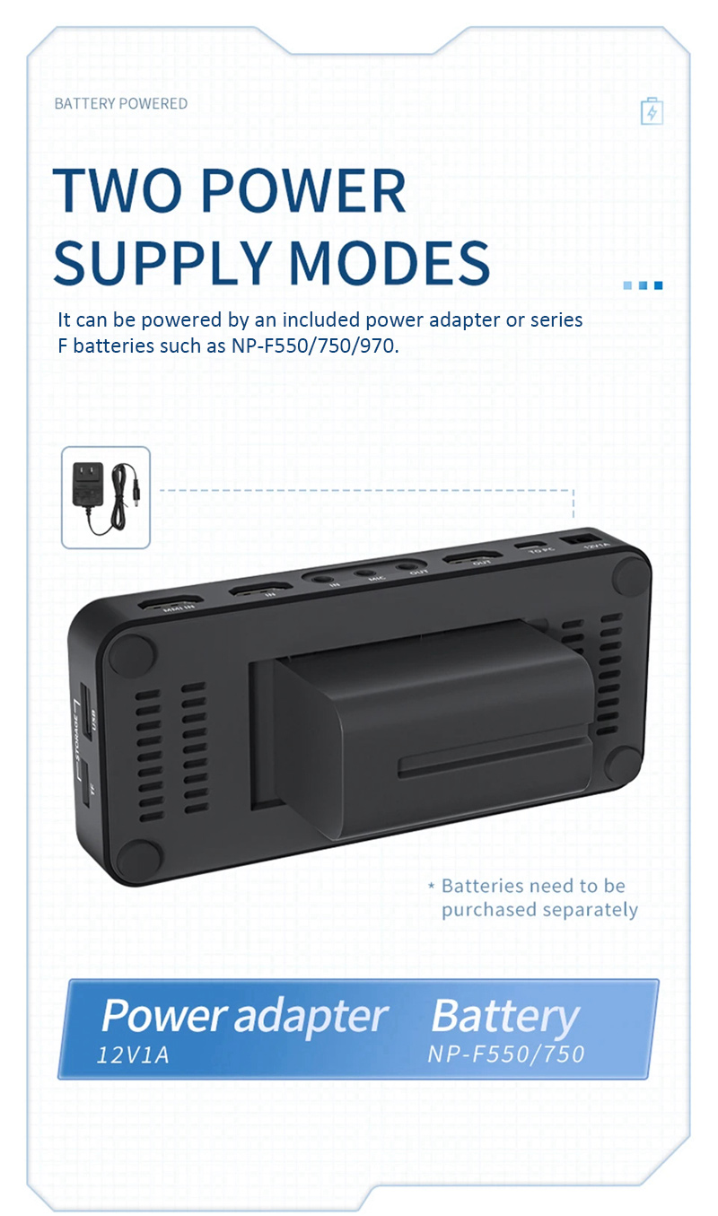 * It can also be powered by series F batteries, including NP-F550/750/970. Batteries are not included in the package.