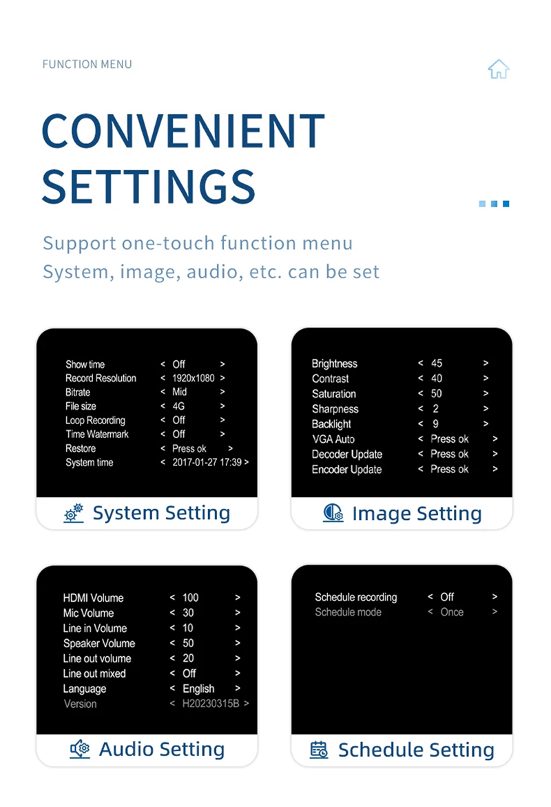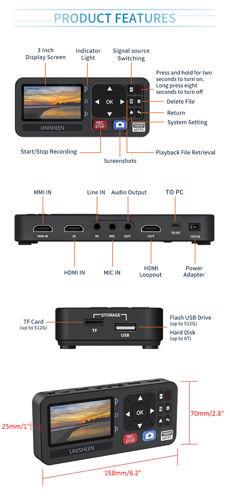 * Storage Device: USB Drive (up to 512G), Hard disk (up to 8T); SD card (up to 512G)